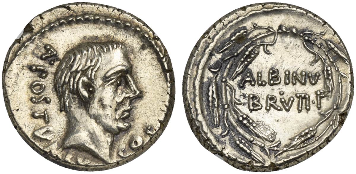 D. Junius Brutus Albinus, Denarius, Rome, 48 BC; AR (g 4,18; mm 17; h 7); Head of A. Postumius r.; around, A POSTVMIVS COS, Rv. ALBINV / BRVTI F, within wreath of corn-ears. Crawford 450/3b; Postumia 14; Sydenham 943a.