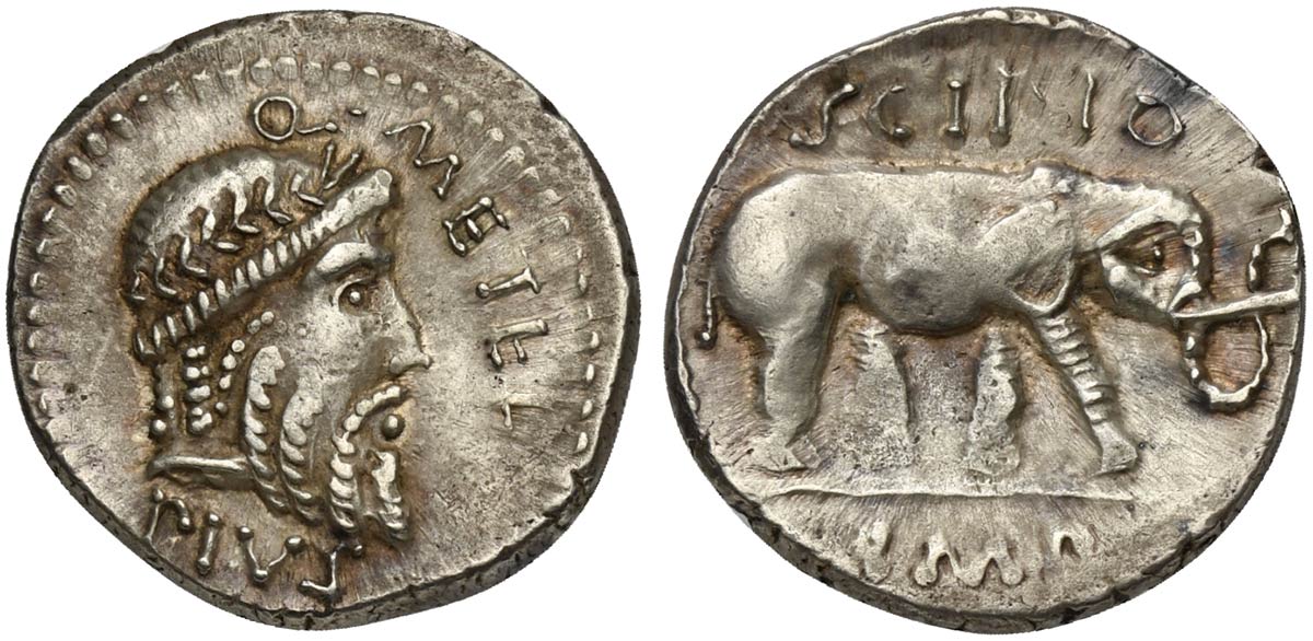 Q. Caecilius Metellus Pius Scipio, Denarius, Military mint travelling with Scipio in Africa, 47-46 BC; AR (g 3,91; mm 19; h 6); Laureate head of Jupiter r.; before, Q METEL; below, PIVS, Rv. Elephant r.; above, SCIPIO; in ex. IMP. Crawford 459/1; Caecilia 47; Sydenham 1046.