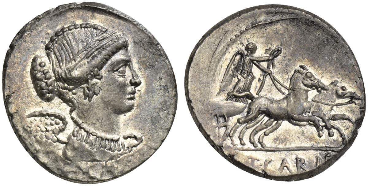 Lot 443 | T. Carisius, Denarius, Rome, 46 BC; AR (g 3,93; mm 20; h 9); Bust of Victory...
