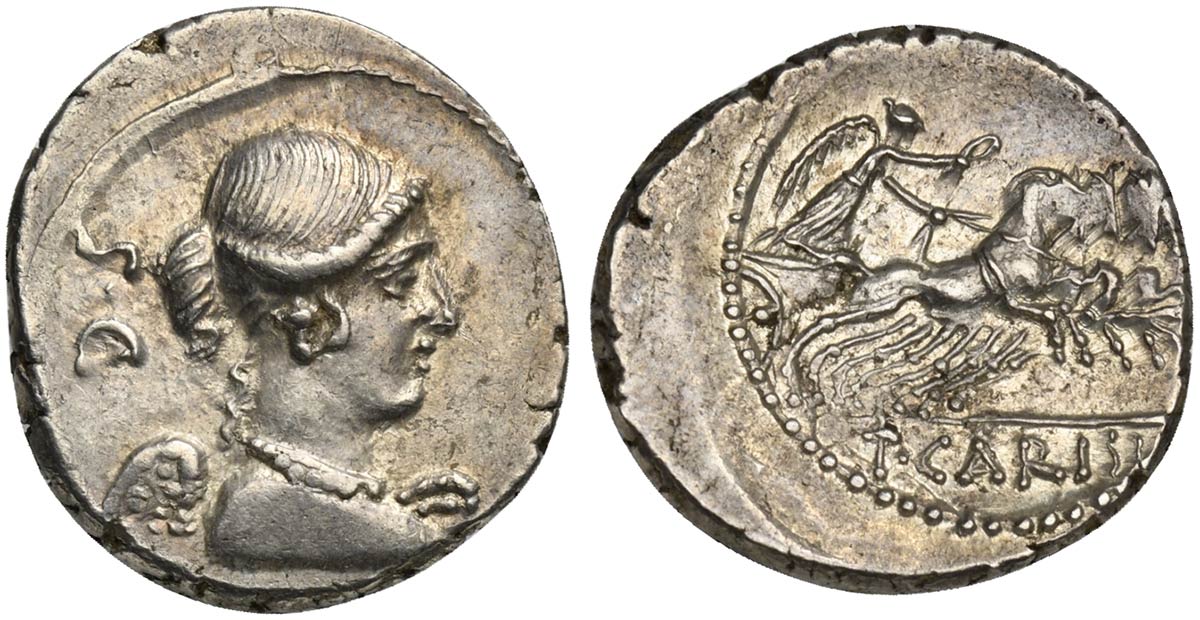 Lot 444 | T. Carisius, Denarius, Rome, 46 BC; AR (g 4,11; mm 19; h 3); Draped bust of...