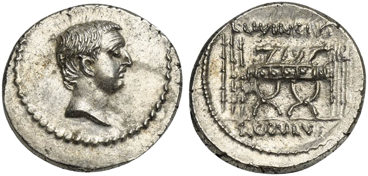 The Caesarians - L. Livineius Regulus, Denarius, Rome, 42 BC; AR (g 3,76; mm 19; h 2); Head of L. Regulus (Pr.) r., Rv. Curule chair; on either side, three fasces; above, L LIVINEIVS; in ex. REGVLVS. Crawford 494/28; Livineia 11; Sydenham 1110.
