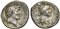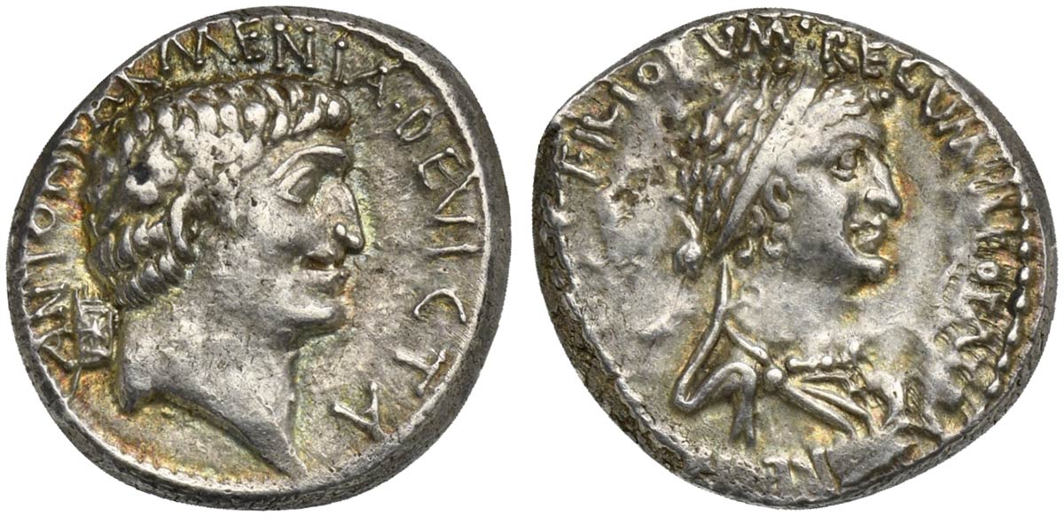 M. Antonius and Cleopatra, Denarius, Uncertain Eastern mint, autumn 34 BC; AR (g 3,95, mm 18, h 1); CLEOPATRA REGINAE REGVM FILIORVM REGVM, diademed and draped bust of Cleopatra r.; at point of bust, prow r., Rv. ANTONI ARMENIA DEVICTA, bare head of Antonius r.; behind, Armenian tiara. Crawford 543/1; Antonia 95; Sydenham 1210.