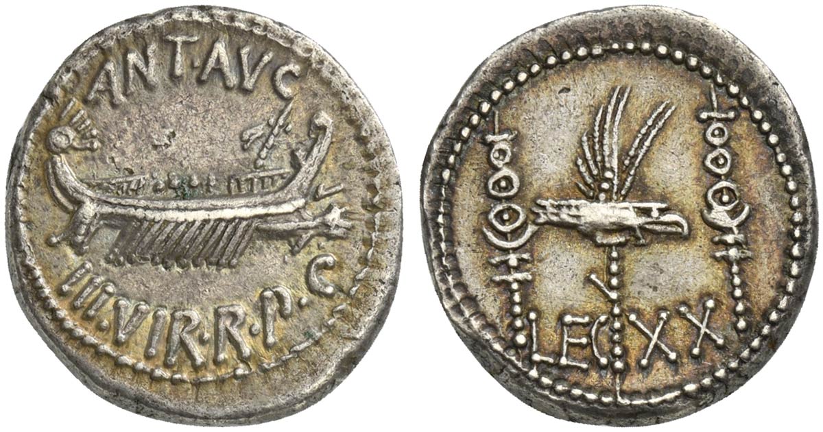 M. Antonius, Denarius, Military mint travelling with Antonius, 32-31 BC; AR (g 3,65; mm 17; h 6); Galley r., with sceptre tied fillet on prow; above, ANT AVG; below, III VIR R P C, Rv. Aquila between two signa; below, LEG - XX. Crawford 544/36; Antonia 135; Sydenham 1243.