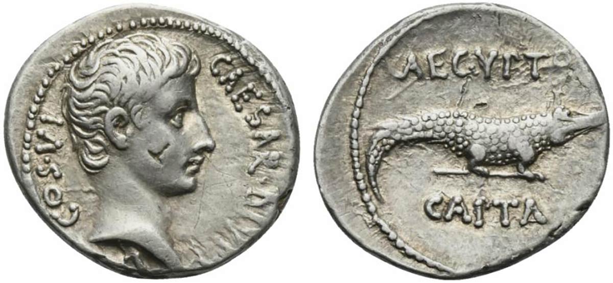 C. Caesar Octavianus, Denarius, uncertain Eastern mint, 28 BC; AR (g 3,85; mm 20; h 6); CAESAR DIVI F - COS VI, bare head r.; below neck, small capricorn r., Rv. AEGVPTO / CAPTA, crocodile r. RIC 545; C 4.