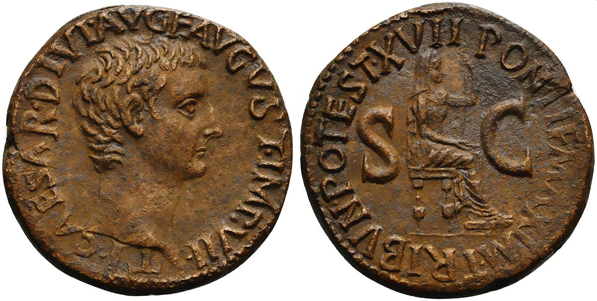 Tiberius (14-37), As, Rome, AD 15-16; AE (g 11,16; mm 28; h 1); TI CAESAR DIVI AVG F AVGVST IMP VII, bare head r., Rv. PONTIF MAXIM TRIBVN POTEST XVII, Livia seated r., holding patera and sceptre; in field, S - C. RIC 33; C 17.