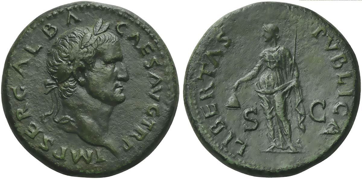 Galba (68-69), Sestertius, Rome, October AD 68; AE (g 25,53; mm 32; h 7); IMP SER GALBA - CAES AVG TR P, laureate head r., Rv. LIBERTAS - PVBLICA, Libertas standing l., holding pileus and vindicta; in field, S - C. RIC 347; C 125.