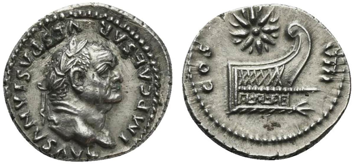 Vespasian (69-79), Denarius, Rome, AD 71; AR (g 3,51; mm 18; h 7); IMP CAESAR VESPASIANVS AVG, laureate head r., Rv. COS - VIII, prow r.; above, star. RIC 108; C 136.