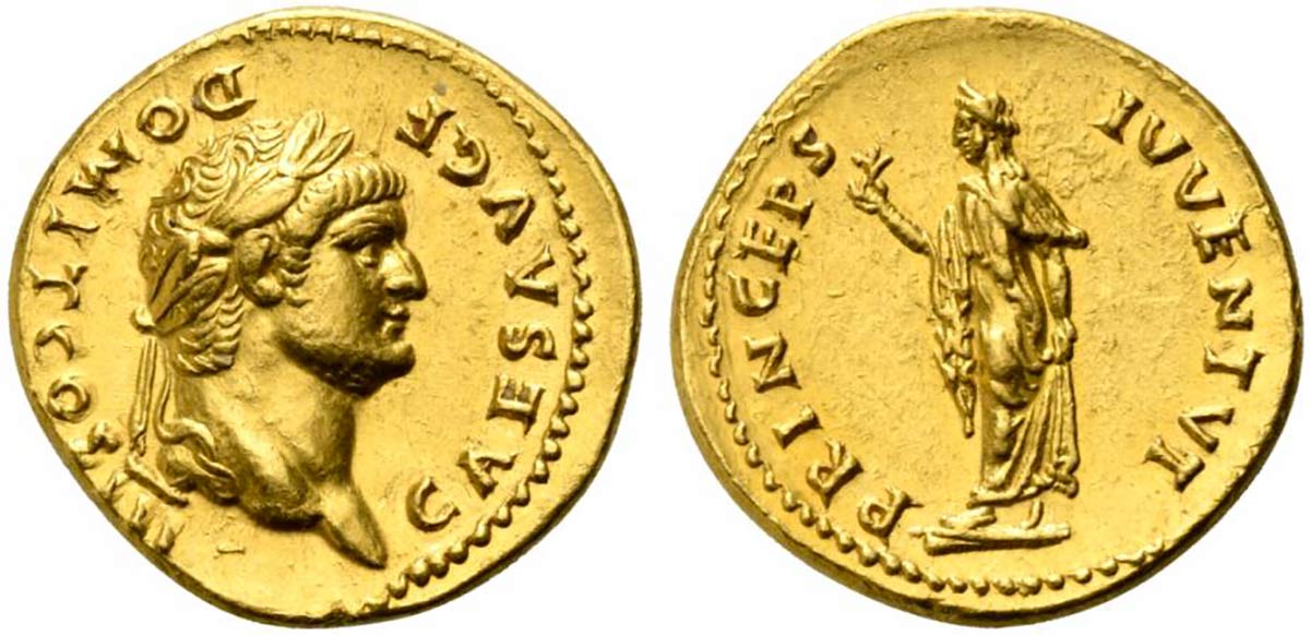Domitian, as Caesar, Aureus struck under Vespasian, Rome, AD 75; AV (g 7,36;...