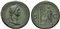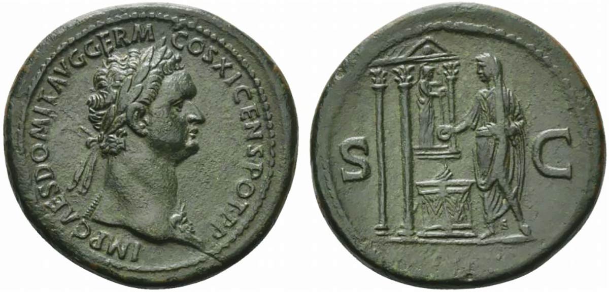 Domitian (81-96), Sestertius, Rome, AD 85; AE (g 27,34; mm 35; h 7); IMP CAES DOMIT AVG GERM - COS XI CENS POT P P, laureate head r., wearing aegis, Rv. Domitian, veiled, standing l. and sacrificing with patera over altar; in the background, shrine containing cult statue of Minerva; in field, S - C. RIC 355; C 492.