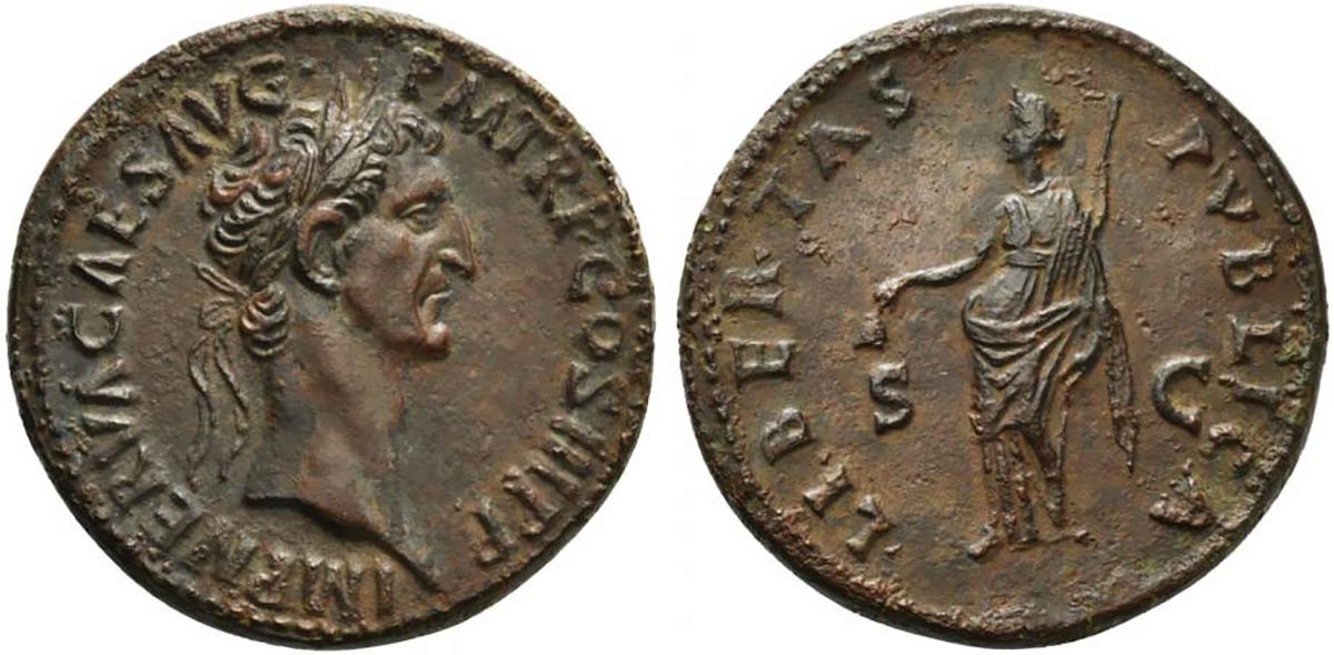Nerva (96-98), Sestertius, Rome, AD 97; AE (g 24,64; mm 33; h 6); IMP NERVA CAES AVG - PM TR P COS III P P, radiate head r., Rv. LIBERTAS - PVBLICA, Libertas standing l., holding pileus and sceptre; in field, S - C. RIC 86; C 118.