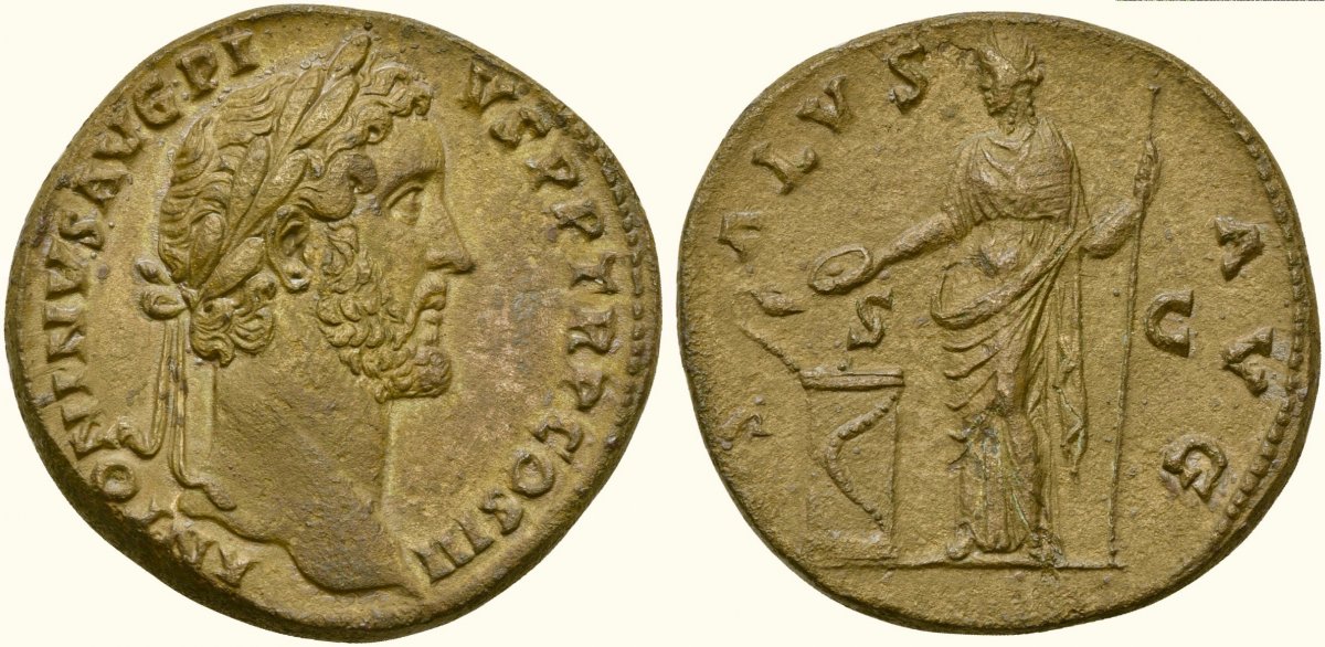 Antoninus Pius (138-161), Sestertius, Rome, AD 140-144; AE (g 24,50; mm 33; h 11); ANTONINVS AVG PI - VS P P TR P COS III, laureate head r., Rv. SALVS - AVG, Salus standing l., holding sceptre and feeding snake coiled round altar; in field, S - C. RIC 635; C 711.
