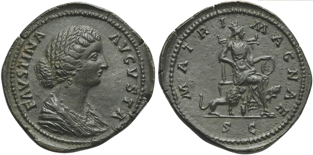 Faustina Minor, Sestertius struck under Marcus Aurelis, AD 161-176; AE (g 23,65; mm 35; h 12); FAVSTINA - AVGVSTA, draped bust r., hair knotted behind, Rv. MATRI - MAGNAE, Cybeles seated r., holding drum; at her side, two lions; in ex. S C. RIC 1663; C 169.