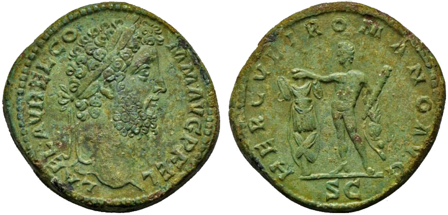 Commodus (177-192), Sestertius, Rome, AD 192; AE (g 26,40; mm 33; h 6); L AEL AVREL CO - MM AVG P FEL, laureate head r., Rv. HERCVLI ROMANO AVG, Naked Hercules with features of Commodus standing l., placing hand on trophy and holding club and lion's skin; in ex. S C. RIC 640; C 203.