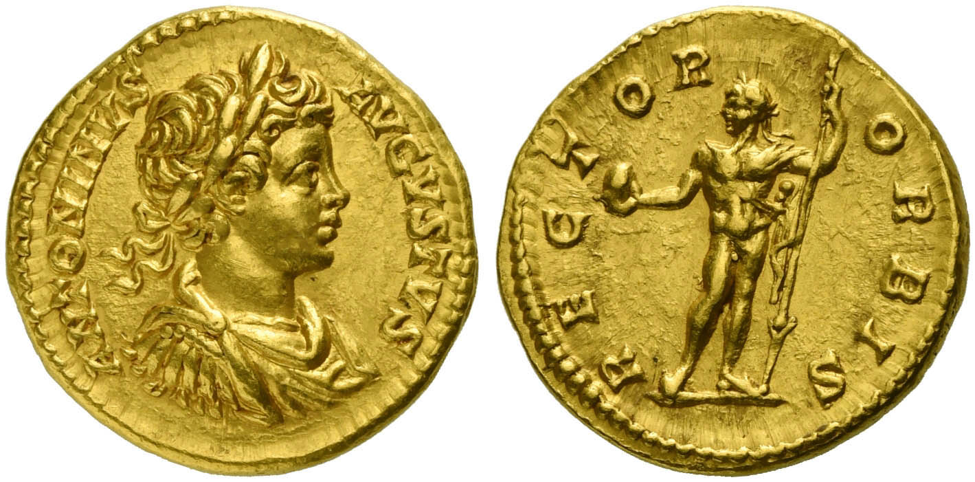 Caracalla (198-217), Aureus, Rome, AD 199-200; AV (g 7,25; mm 19; h 12); ANTONINVS - AVGVSTVS, laureate, draped and cuirassed bust r., Rv. RECTOR ORBIS, Sol standing l., holding globe and reverse spear. RIC 39a, C 541; Calicó 2804.