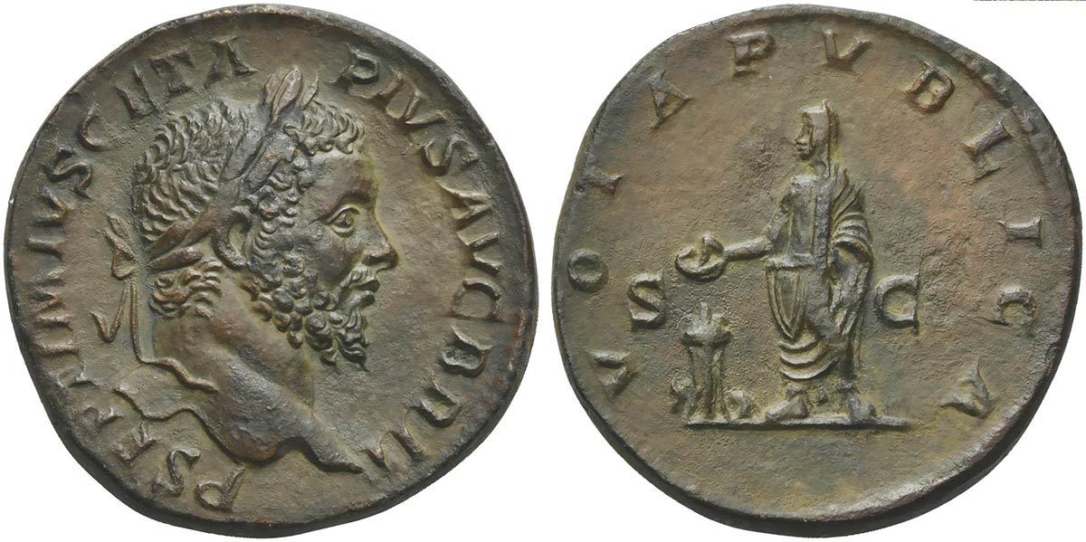 Geta (209-212), Sestertius, Rome, AD 210-212; AE (g 23,81; mm 31; h 6); P SEPTIMIVS GETA - PIVS AVG BRIT, laureate head r., Rv. VOTA PVBLICA, Geta, veiled, standing l., sacrificing out of patera over tripod; by tripod, bull; in field, S - C. RIC 187a; C 232.