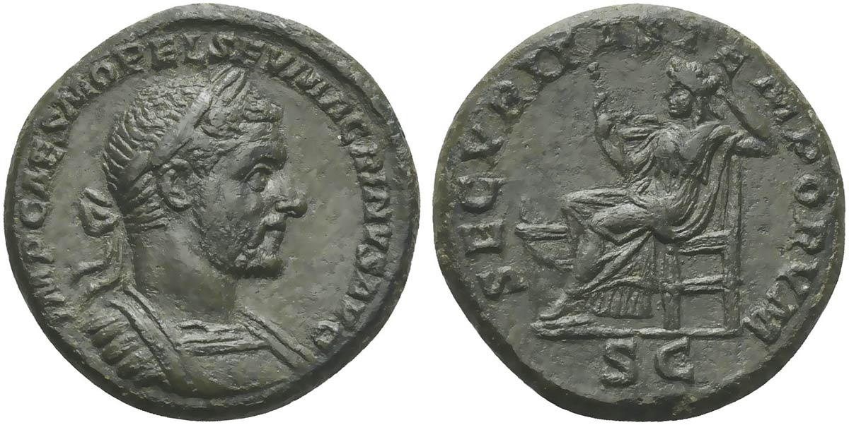 Macrinus (217-218), As, Rome, AD 217-218; AE (g 11,26; mm 24; h 5); IMP CAES M OPEL SEV MACRINVS AVG, laureate and cuirassed bust r., Rv. SECVRITAS TEMPORVM, Securitas seated l., holding sceptre; before her, altar; in ex., S C. RIC 207; C 130.