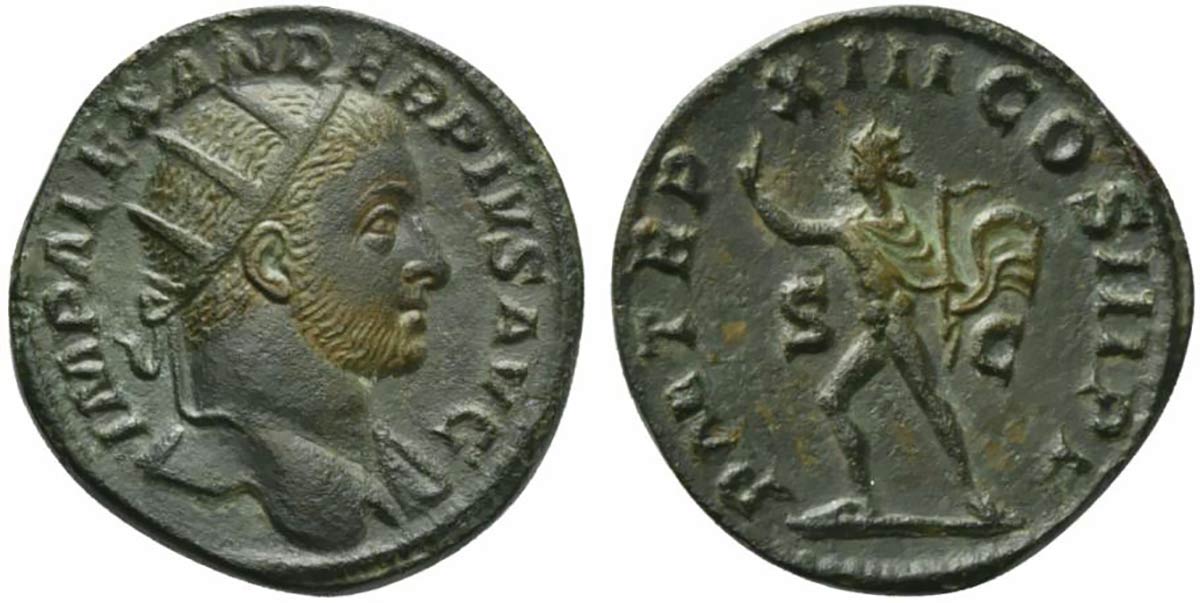 Severus Alexander (222-235), Dupondius, Rome, AD 234; AE (g 10,95; mm 25; h 1); IMP ALEXANDER PIVS AVG, radiate bust r., drapery on l. shoulder, Rv. P M TR P - XIII COS III P P, Sol standing l., raising hand and holding whip; in field, S - C. RIC 539; C 451.