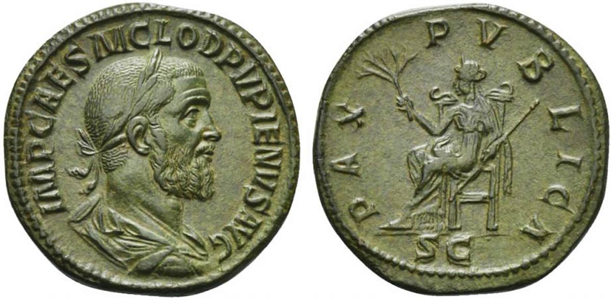 Pupienus (238), Sestertius, Rome, April - June AD 238; AE (g 19,91; mm 30; h 12); IMP CAES M CLOD PVPIENVS AVG, laureate, draped and cuirassed bust r., Rv. PAX - PVBLICA, Pax seated l., holding branch and sceptre; in ex. S C. RIC 22a; C 23.