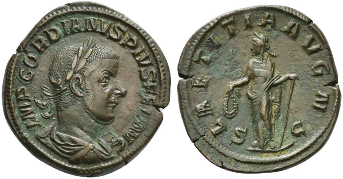 Gordian III (238-244), Sestertius, Rome, AD 241-243; AE (g 20,61; mm 32; h 12); IMP GORDIANVS PIVS FEL AVG, laureate, draped and cuirassed bust r., Rv. LAETITIA AVG N, Laetitia standing l., holding wreath and leaning on anchor; in field, S - C. RIC 300a; C 122.