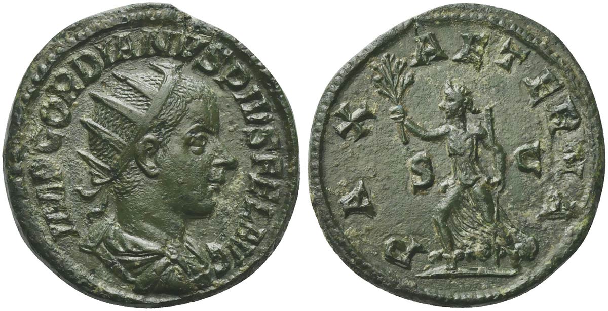 Emerald green patina, good extremely fine. [Ex Classical Numismatic Group, Triton V, January 2002, lot 2080; from the George His Collection of coins of Gordian III; ex Sternberg XIX, 18-19 November 1987, lot 776]