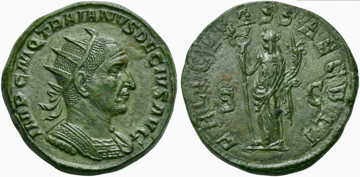 Trajan Decius (249-251), Double Sestertius, Rome, AD 249-251; AE (g 38,15; mm 35; h 12); IMP C M Q TRAIANVS DECIVS AVG, radiate, draped and cuirassed bust r., Rv. FELICITAS SAECVLI, Felicitas standing l., holding long caduceus and cornucopiae. RIC 115c; C 40.