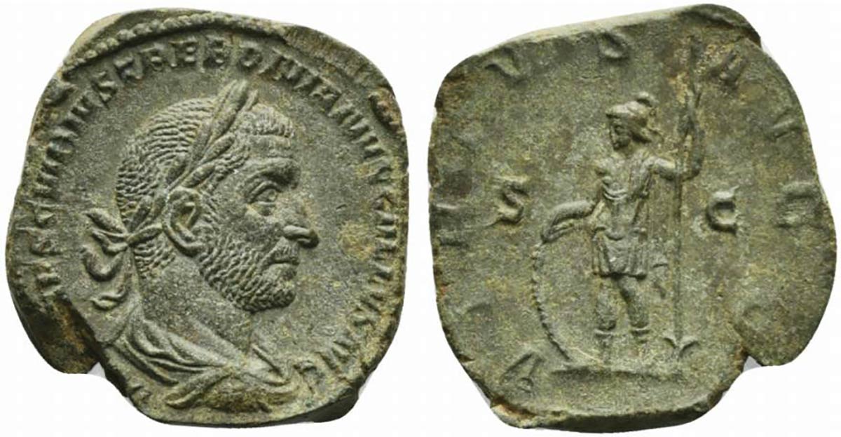 Trebonianus Gallus (251-253), Sestertius, Rome, AD 251-253; AE (g 18,11; mm 29; h 12); IMP CAES C VIBIVS TREBONIANVS GALLVS AVG, laureate, draped and cuirassed bust r., Rv. VIRTVS - AVGG, Virtus standing l., resting hand on shield and holding spear reversed. RIC 126a; C 134.