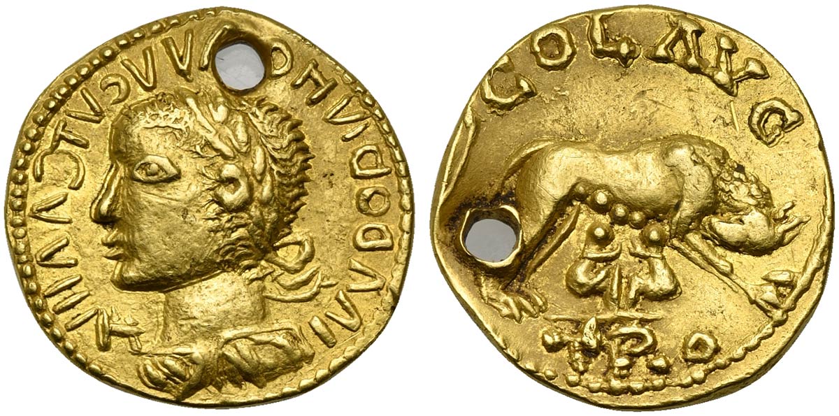 Of the highest rarity, only 6 specimen known of the entire gold series. Holed, otherwise extremely fine.