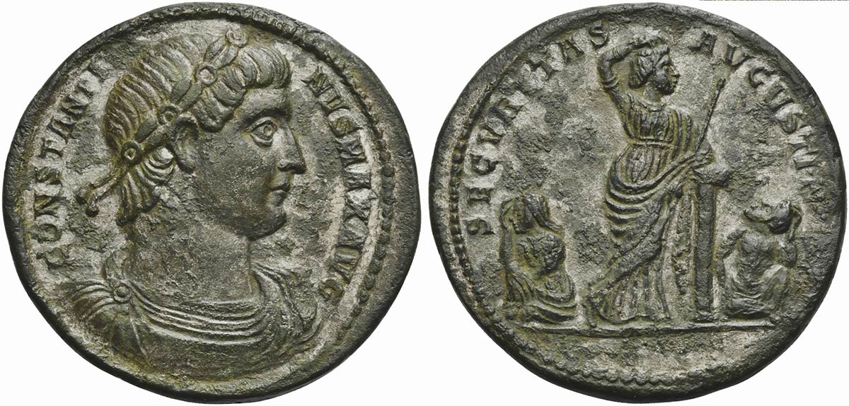 Constantine I (306-337), Medallion, Rome, ca. AD 327-333; AE (g 29,62; mm 39; h 6); CONSTANTI - NVS MAX AVG, diademed, draped and cuirassed bust r., Rv. SECVRITAS - AVGVSTI N, Securitas standing l., head r., holding sceptre and resting elbow on column; two captives seated l. and r., back to back, in attitude of mourning. C 170/493; Gnecchi II, n. 9, pl. 130,7.