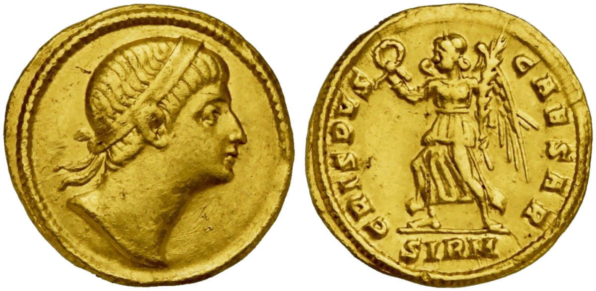 Crispus Caesar (317-326), Solidus struck under Constantine I, Sirmium, AD 325-326; AV (g 4,32; mm 19; h 8); Diademed head r., with uplifted gaze, Rv. CRISPVS - CAESAR, Victory advancing l., holding wreath and palm; in ex, SIRM. RIC 63.