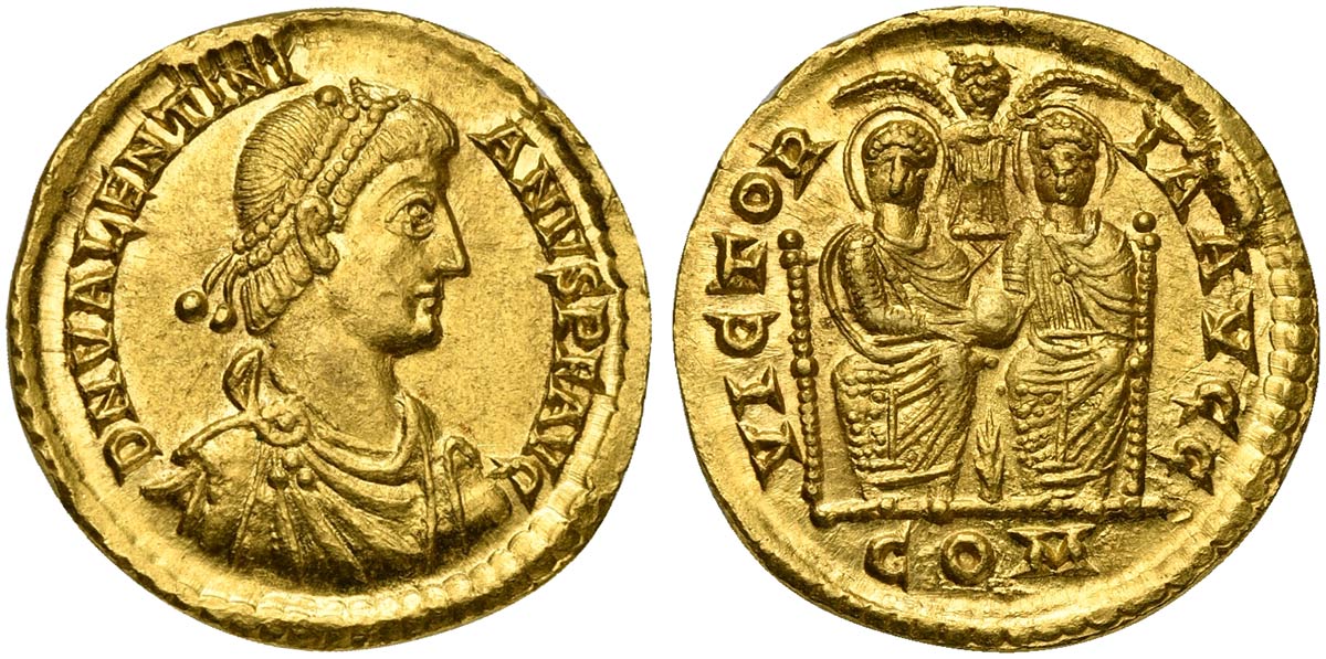 Valentinian II (375-392), Solidus, Uncertain mint in Northern Italy (Mediolanum ?), AD 385; AV (g 4,45; mm 20; h 1); D N VALENTINI - ANVS P F AVG, diademed, draped and cuirassed bust r., Rv. VICTOR - IA AVGG, Theodosius I and Gratian enthroned facing, together holding globe; behind and between Victory with outspread wings; between them below, a palm-branch; in ex. COM. RIC 5e (Milan) and 8a.1.