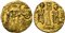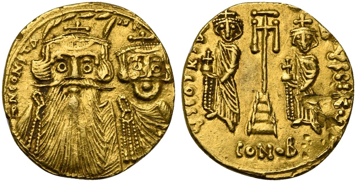 Constans II (641-668), Solidus, Syracuse, AD 659-661; AV (g 4,36; mm 20; h 6); Crowned and draped facing busts of Constans and Constantine IV; above, cross, Rv. Cross potent set on three steps between standing figures of Heraclius and Tiberius, each holding globus cruciger. DOC 161c; Sear 1083; Spahr 48.