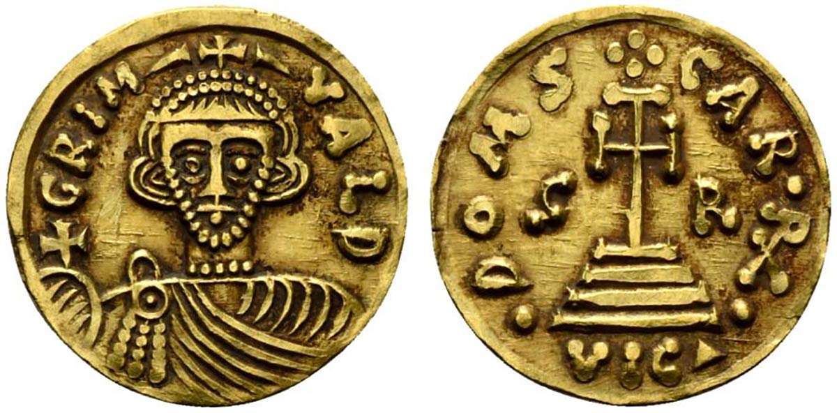 Duchy of Beneventum, Grimoaldus III and Charlemagne, Tremissis, AD 788-792; AV (g 1,23; mm 17; h 6); GRIM - + - VALD, crowned bust facing, holding cross on globe. Rv. • DOMS (four pellets) CAR • RX cross potent between two pellets, G – R across field; VIC (triangle) in exergue. LCSI 63c; CNI 8-9; MEC 1098; BMC Vand 7.