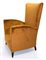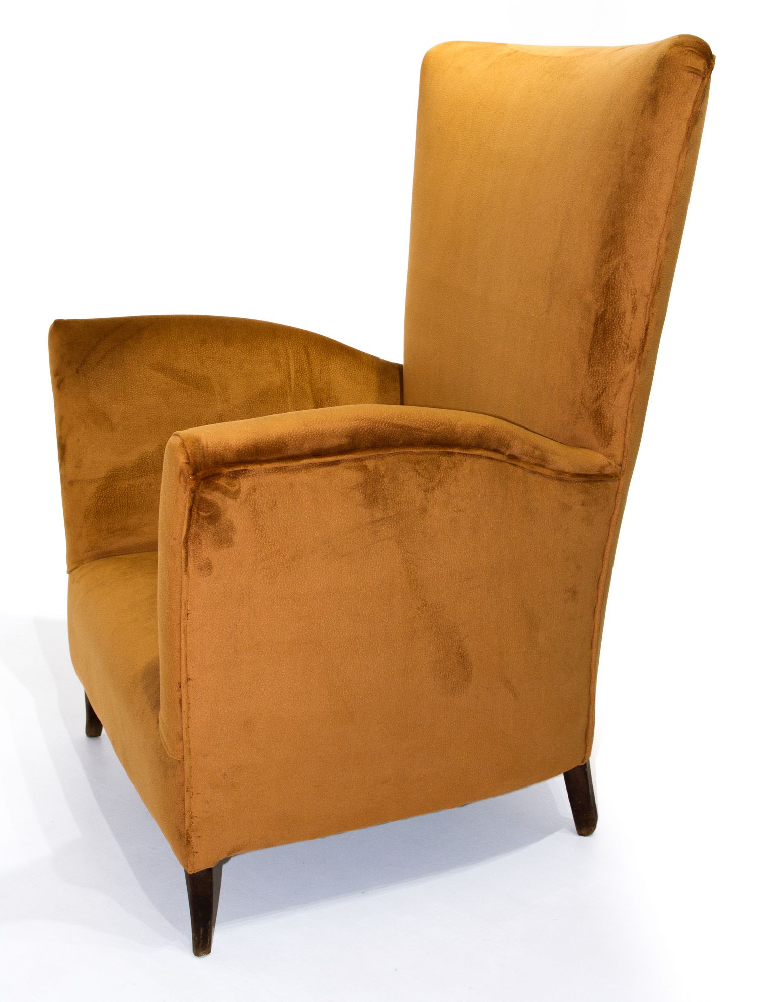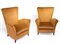 Coppia di poltrone con struttura in legno e spalliera alta. Interamente ricondizionate, color cognac. Anni 50. H cm 118x77x70