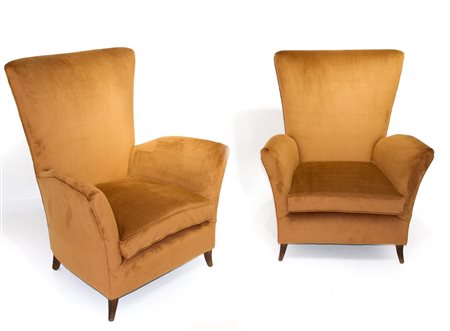 Coppia di poltrone con struttura in legno e spalliera alta. Interamente...