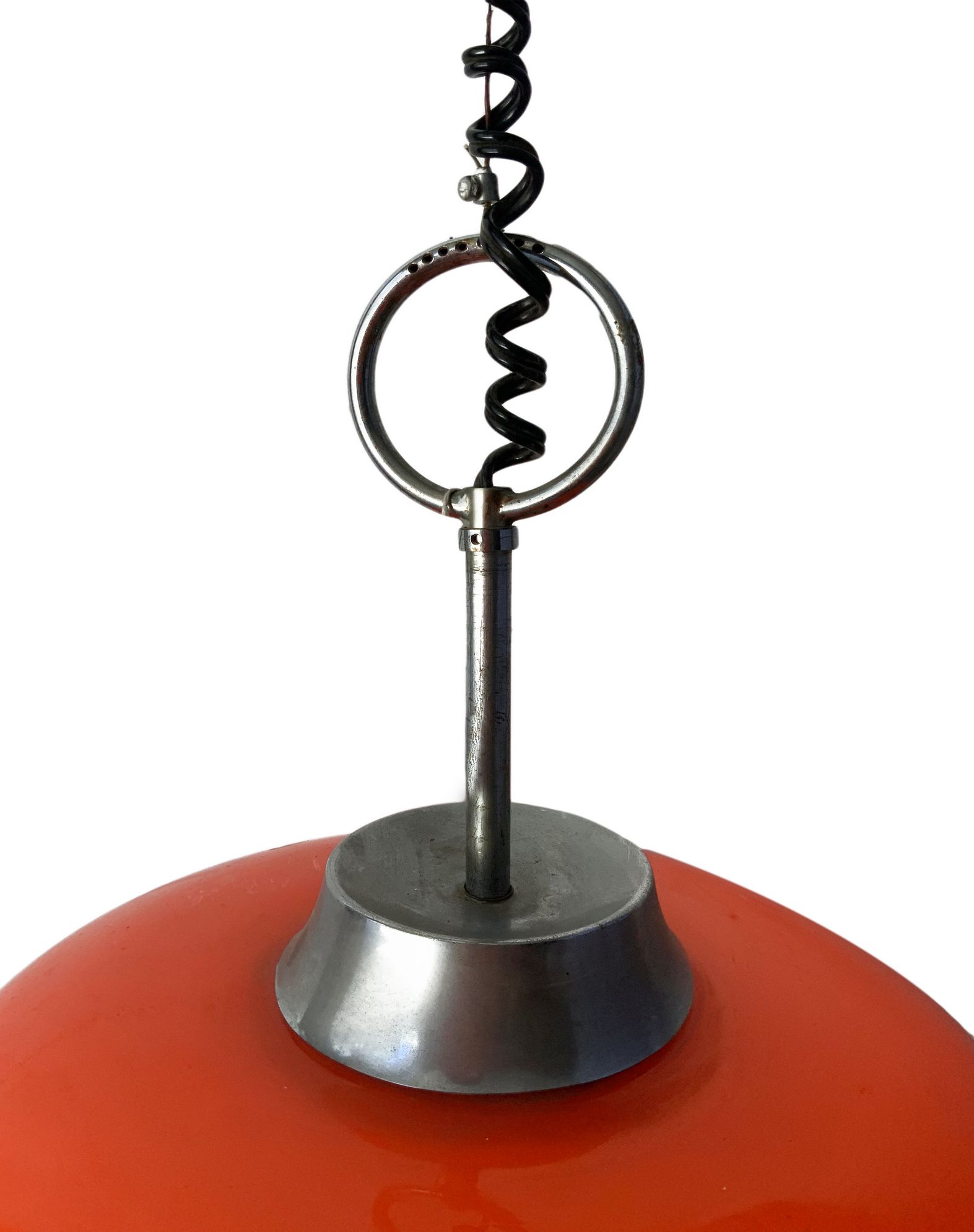 Lampada a sospensione in vetro, Vistosi, attribuibile ad Ettore SottSass. Composta da due corpi: uno in vetro iridescente, uno sovraddiffusore in vetro incamiciato colore arancione. Anni 60. Cm 45 x38d