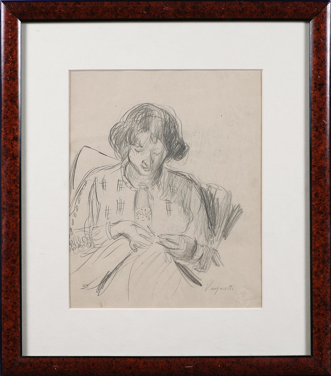 VAGNETTI GIANNI (1897 - 1956) Donna che cuce. Matita su carta. Cm 25,00 x 31,00. Firma in basso a destra, timbro a secco Eredi Vagnetti in basso a destra. Cornice presente