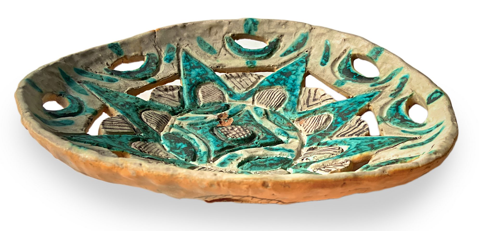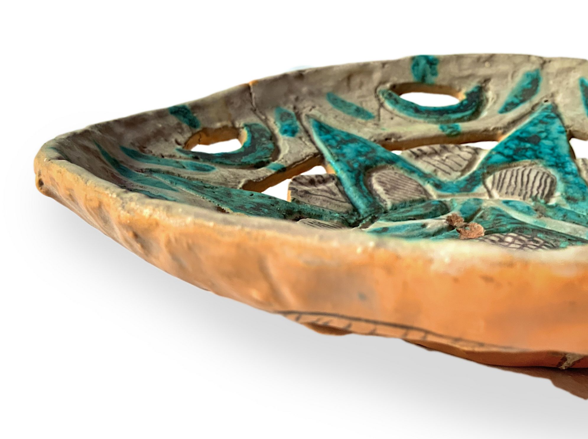 Piatto da parete in terracotta, produzione italiana. Decorata nei toni del verde acqua, decoro informale lungo la tesa. Anni 60. Cm 24d
