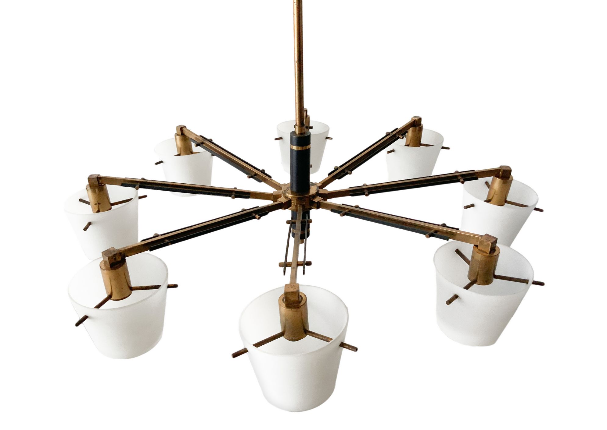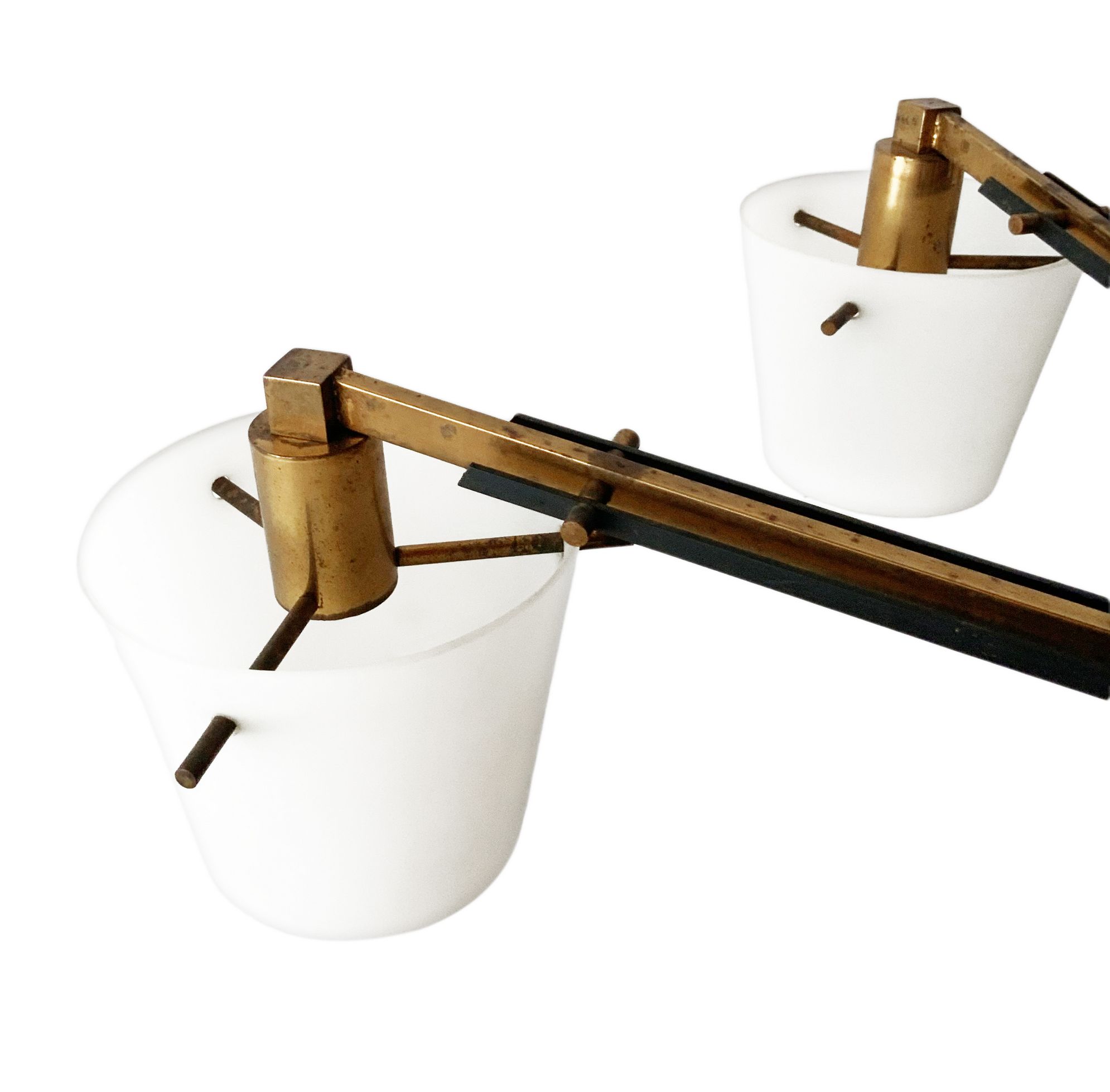 Stilnovo Milano, lampada a sospensione con struttura in ottone zapponato dettagli in ottone laccato nero diffusori in vetro triplex opal di forma troncoconica, tracce di ossido. Anni 50 Cm 83x78d