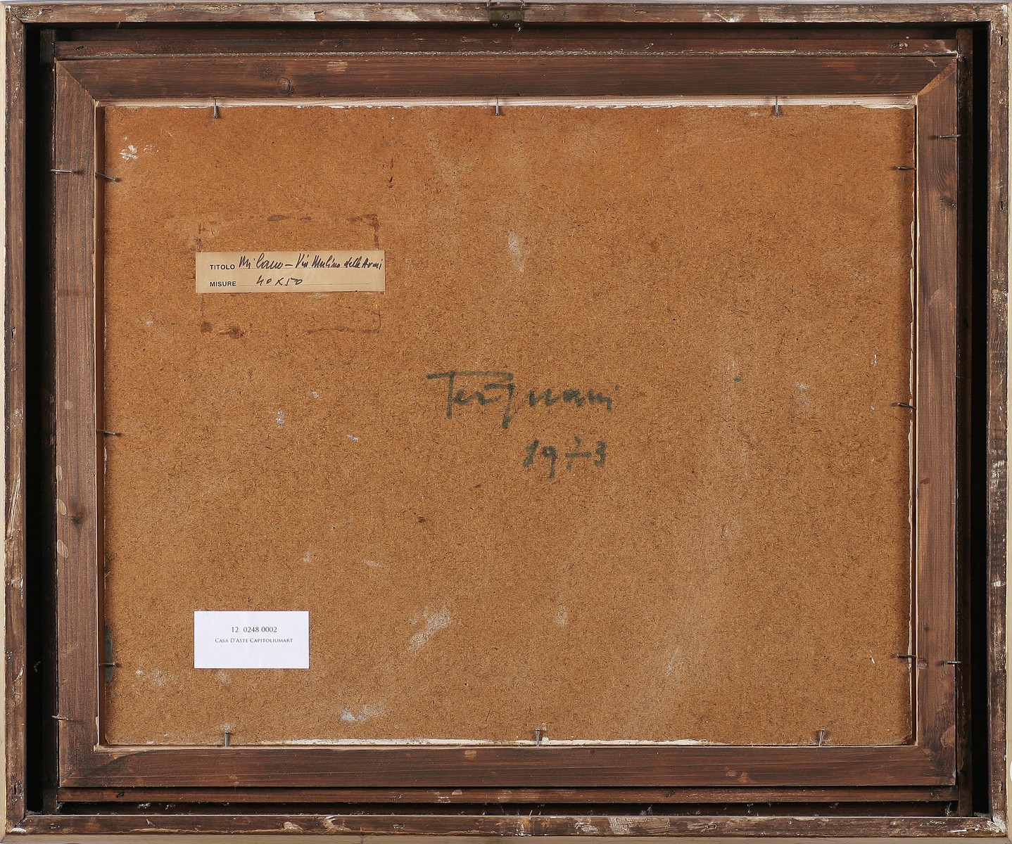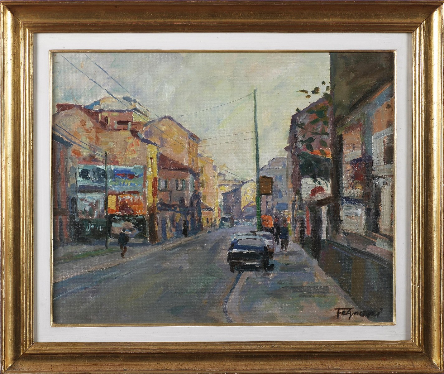 FERGNANI CORRADO (1910 - 1986) Via Mulino delle Armi, Milano. 1973. Olio su tavola. Cm 40,00 x 50,00. Firma in basso a destra. Al retro firma data e cartiglio descrittivo. Cornice presente