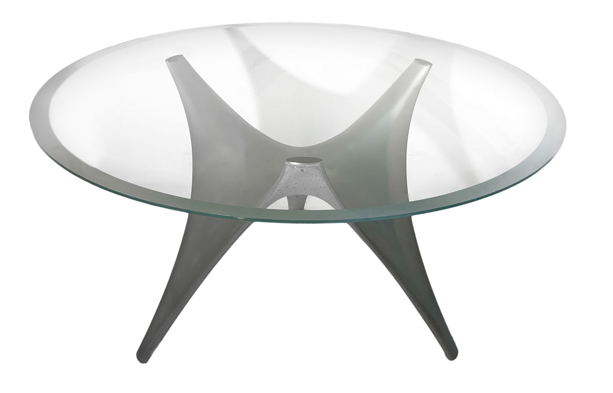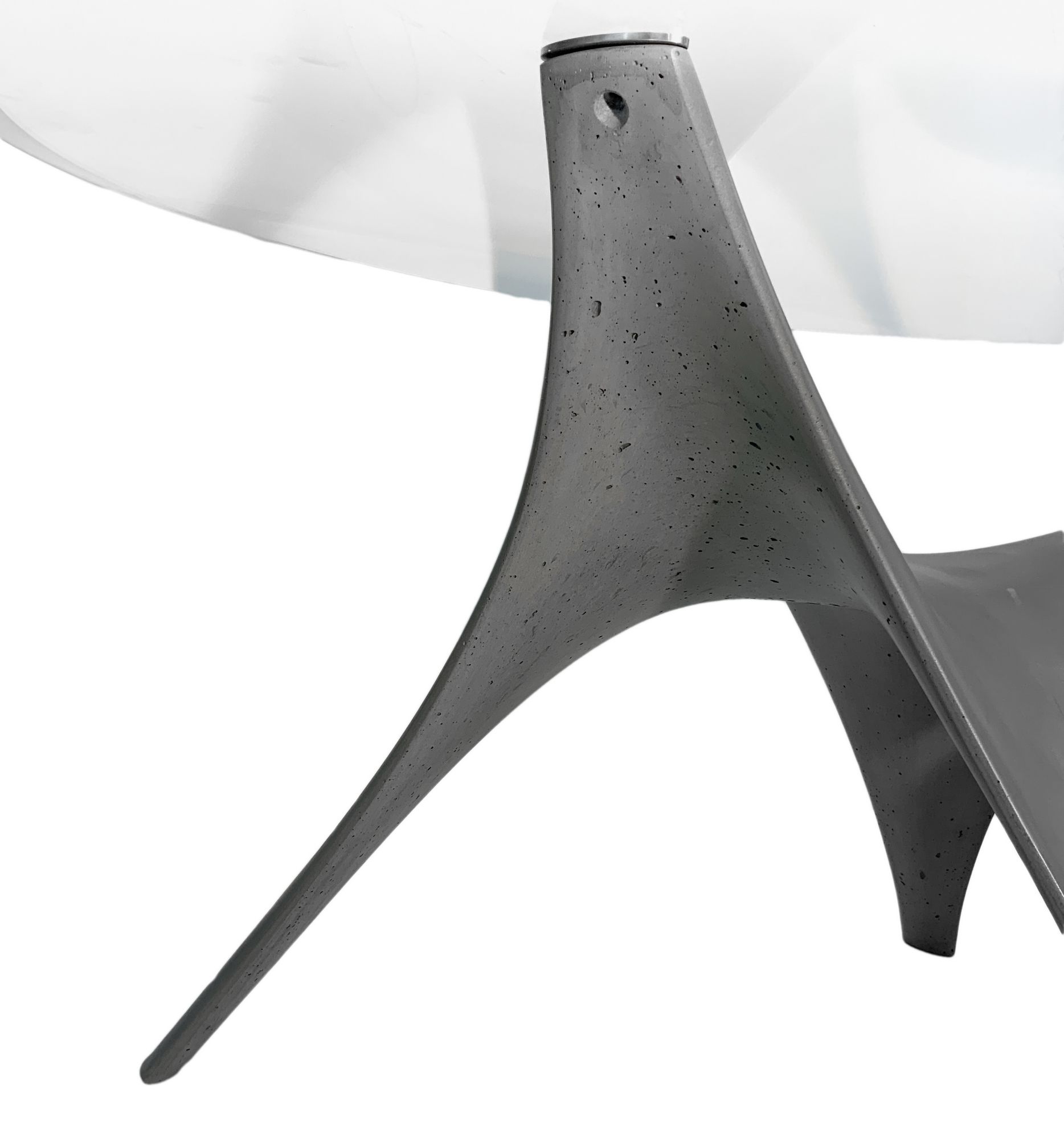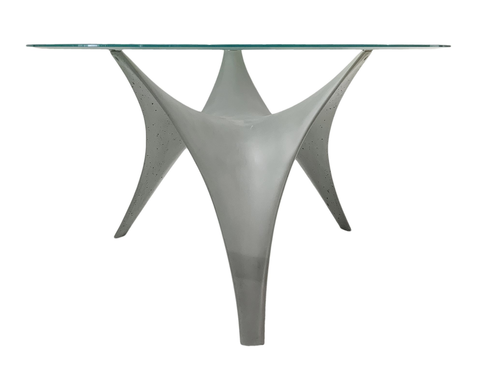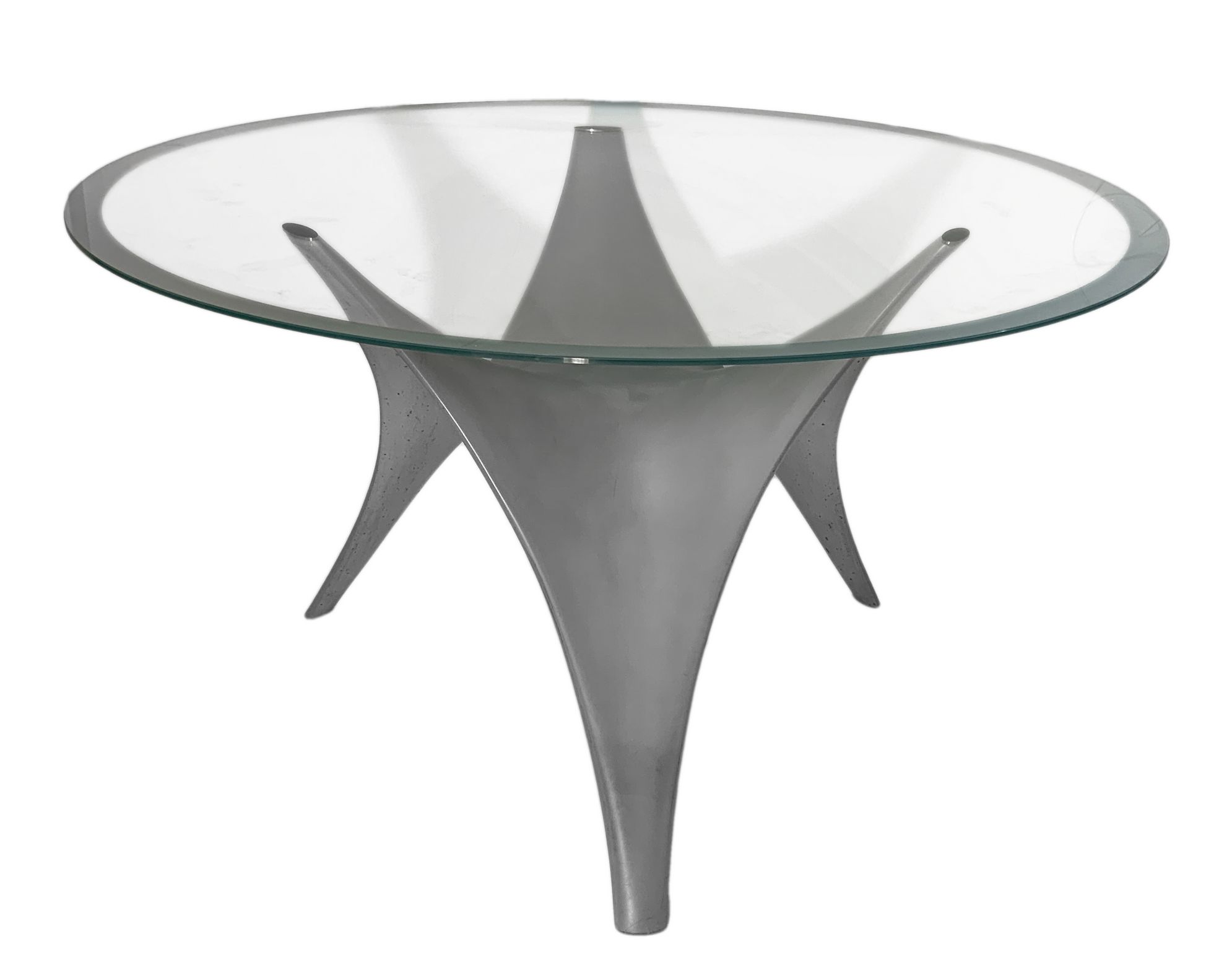 Produzione Molteni, Design Foster + Partenrs, mod. Arc, tavolo scultura, piano di forma rotonda in vetro trasparente, basamento di forma complessa in fibra di cemento "leggera" stampata e colorata in massa. Segni d'uso.?????????????????
