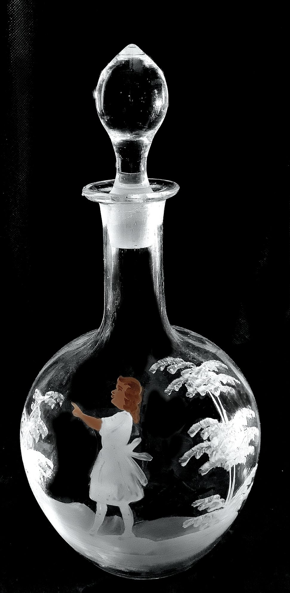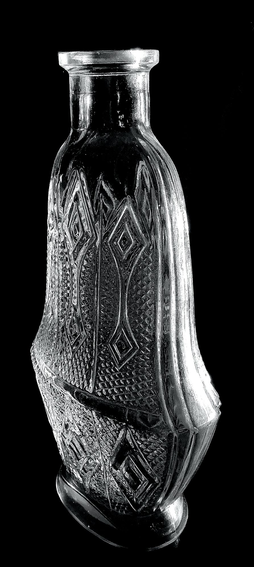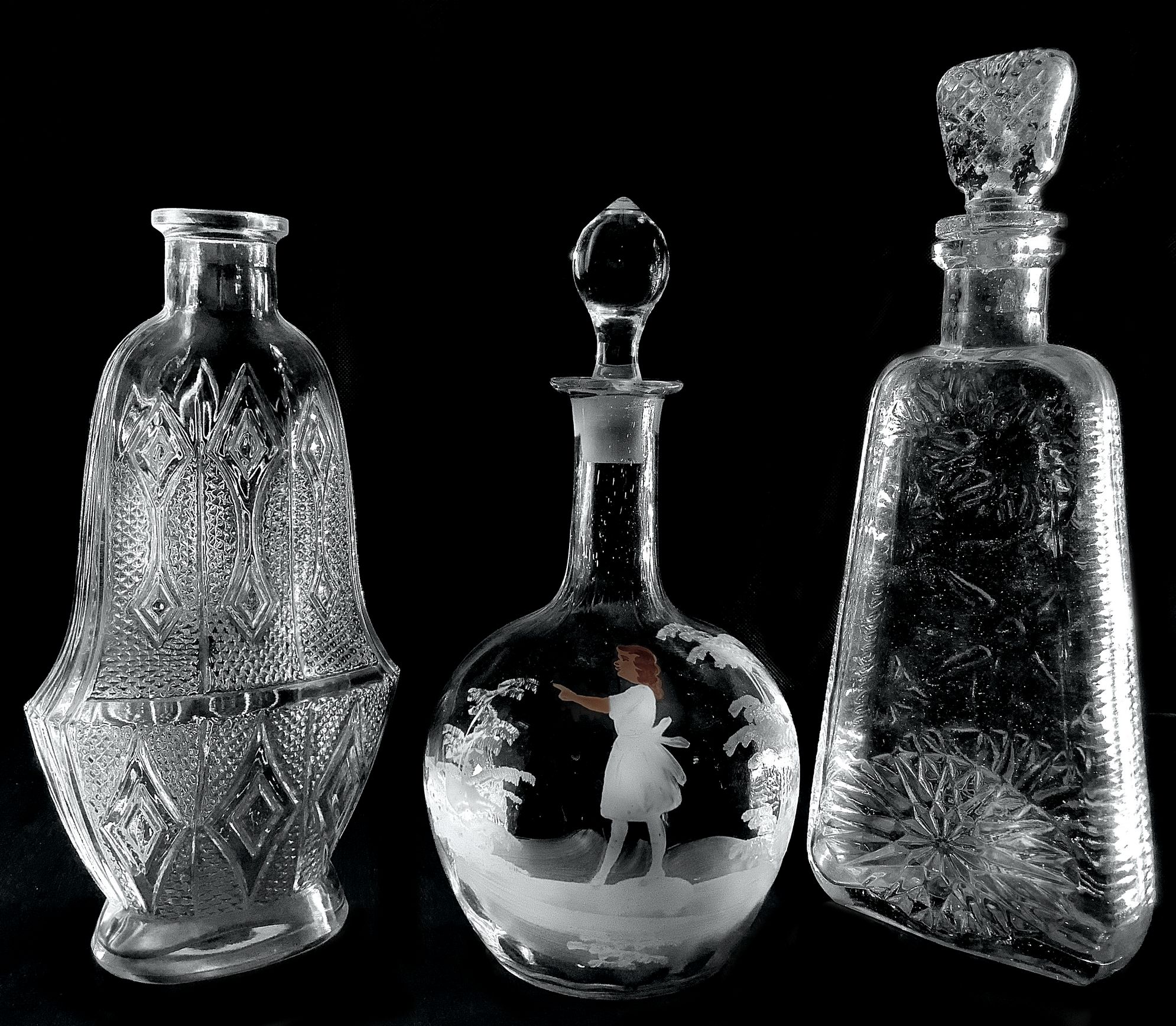 Gruppo di n. 3 bottiglie in vetro e cristallo, XX secolo. Vari formati e forme. Tappi adattati.