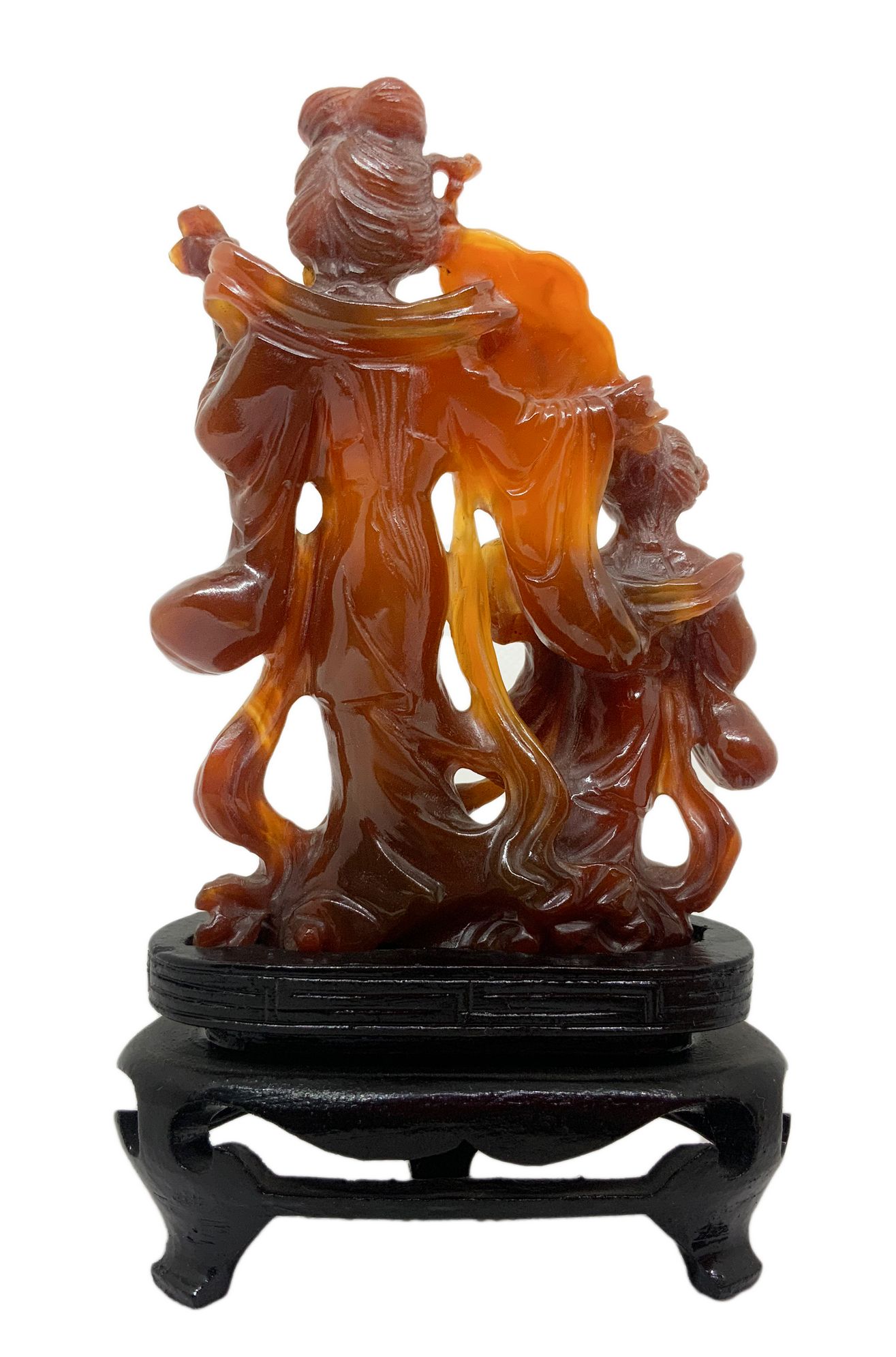 Statuetta in corniola di colore bruno raffigurante “Maternità” (Guanine con figlia). H cm 11. H con base cm 15. Larghezza cm 7.