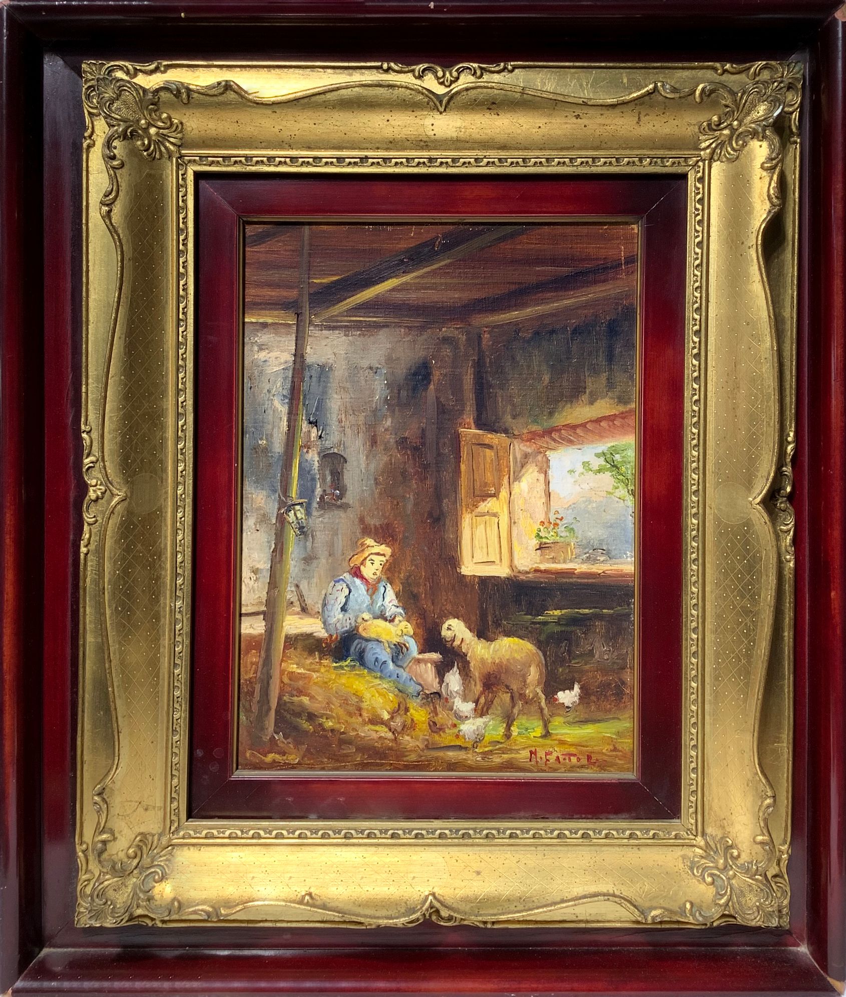 Olio su cartone telato raffigurante ragazzo in una stalla, Mario Fattori (1930). Cm 25x35
