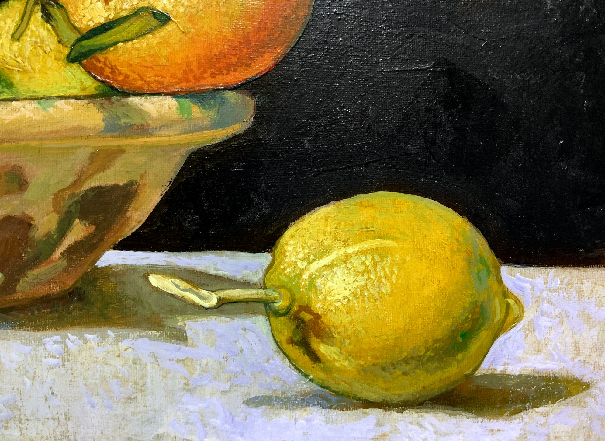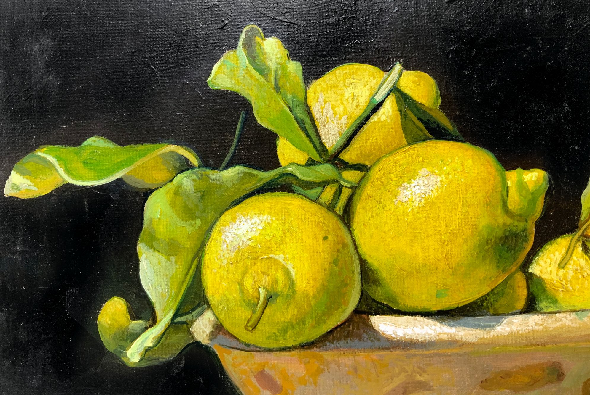 Dipinto ad olio su tela raffigurante natura morta di limoni, Saro Tricomi...