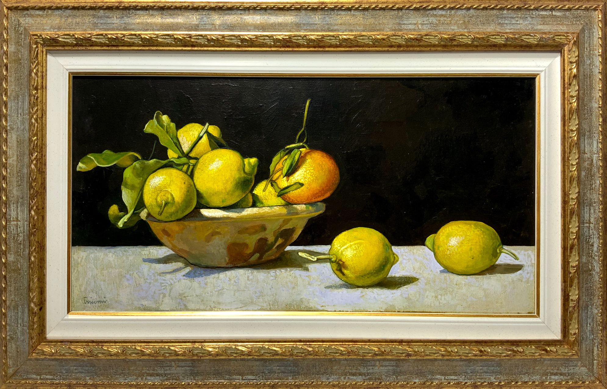 Dipinto ad olio su tela raffigurante natura morta di limoni, Saro Tricomi (Catania, 1937). Cm 30x60, olio su tela. Firmato in basso a sinistra. Datato 2013 e firmato sul retro.