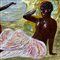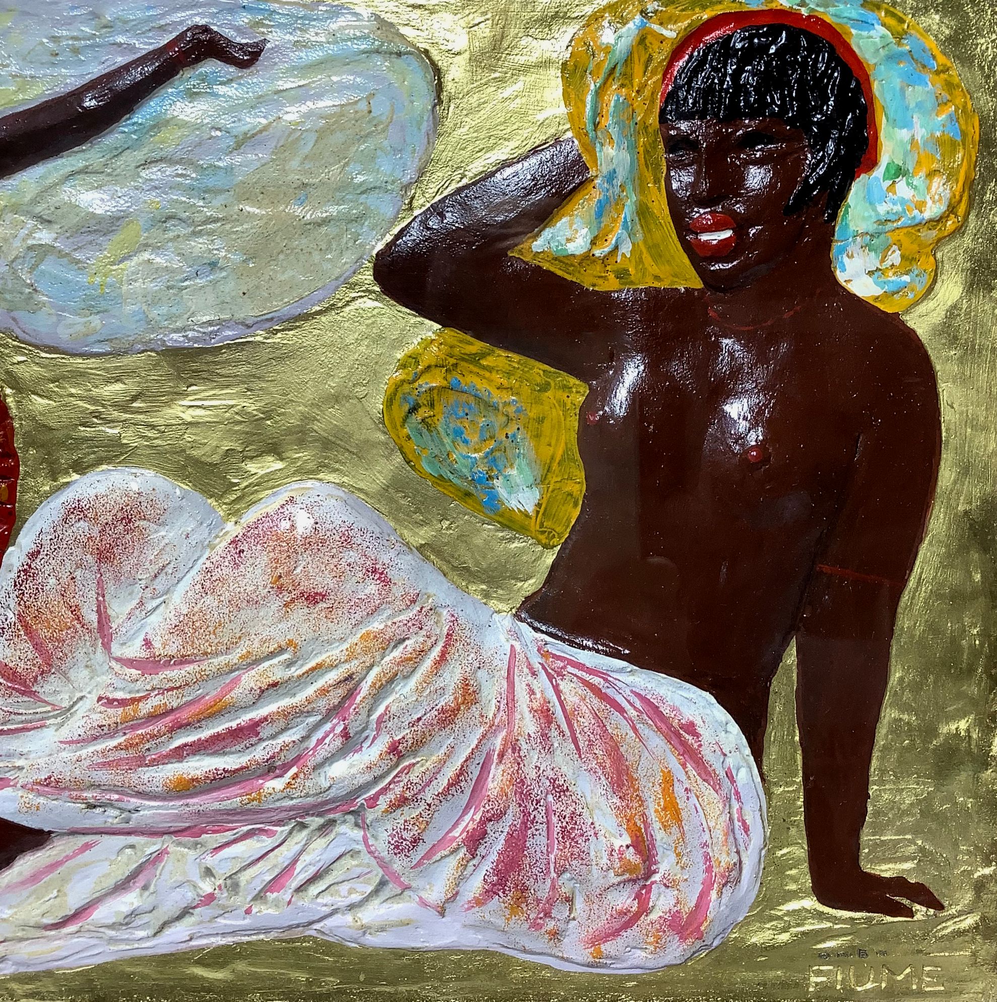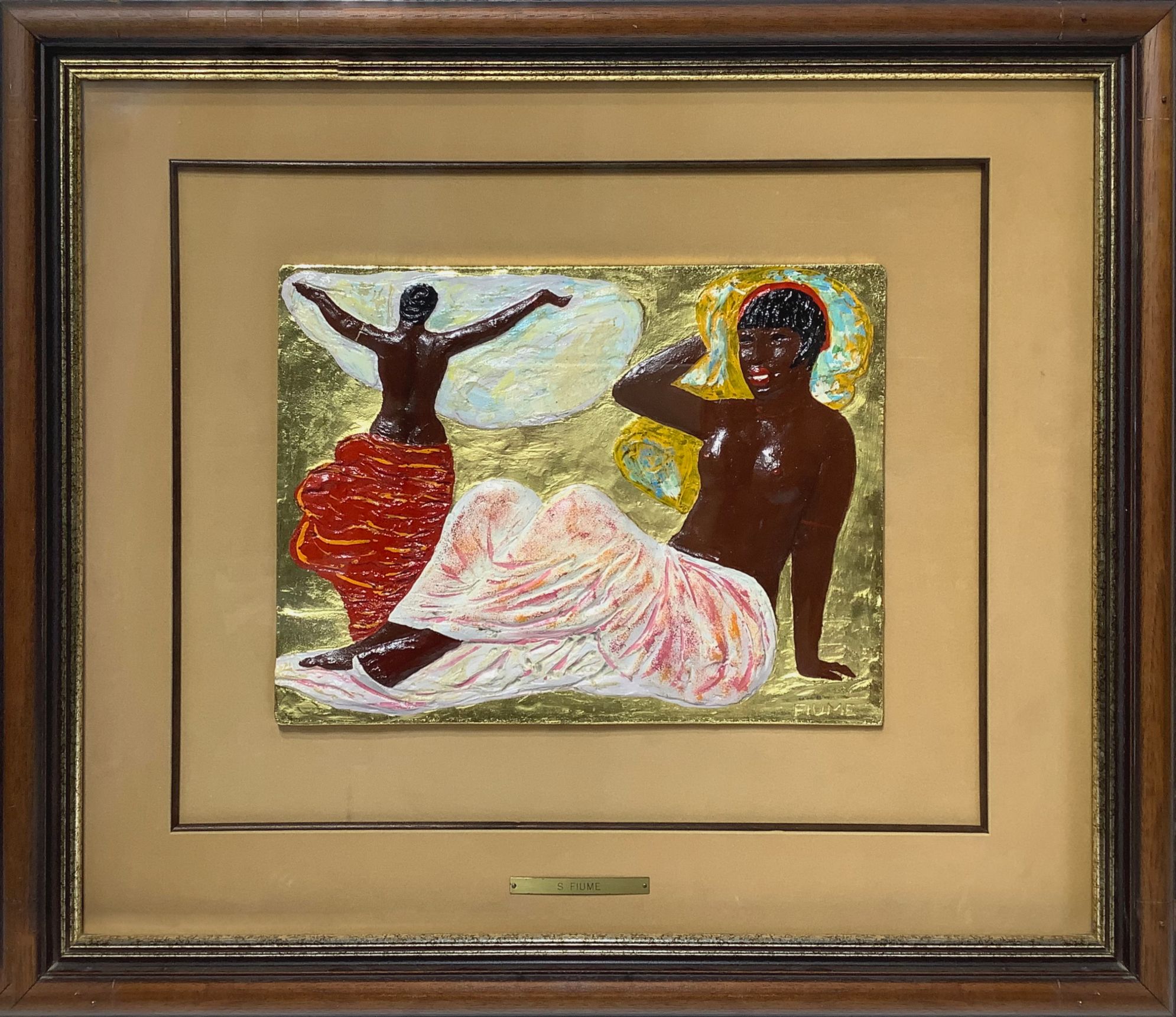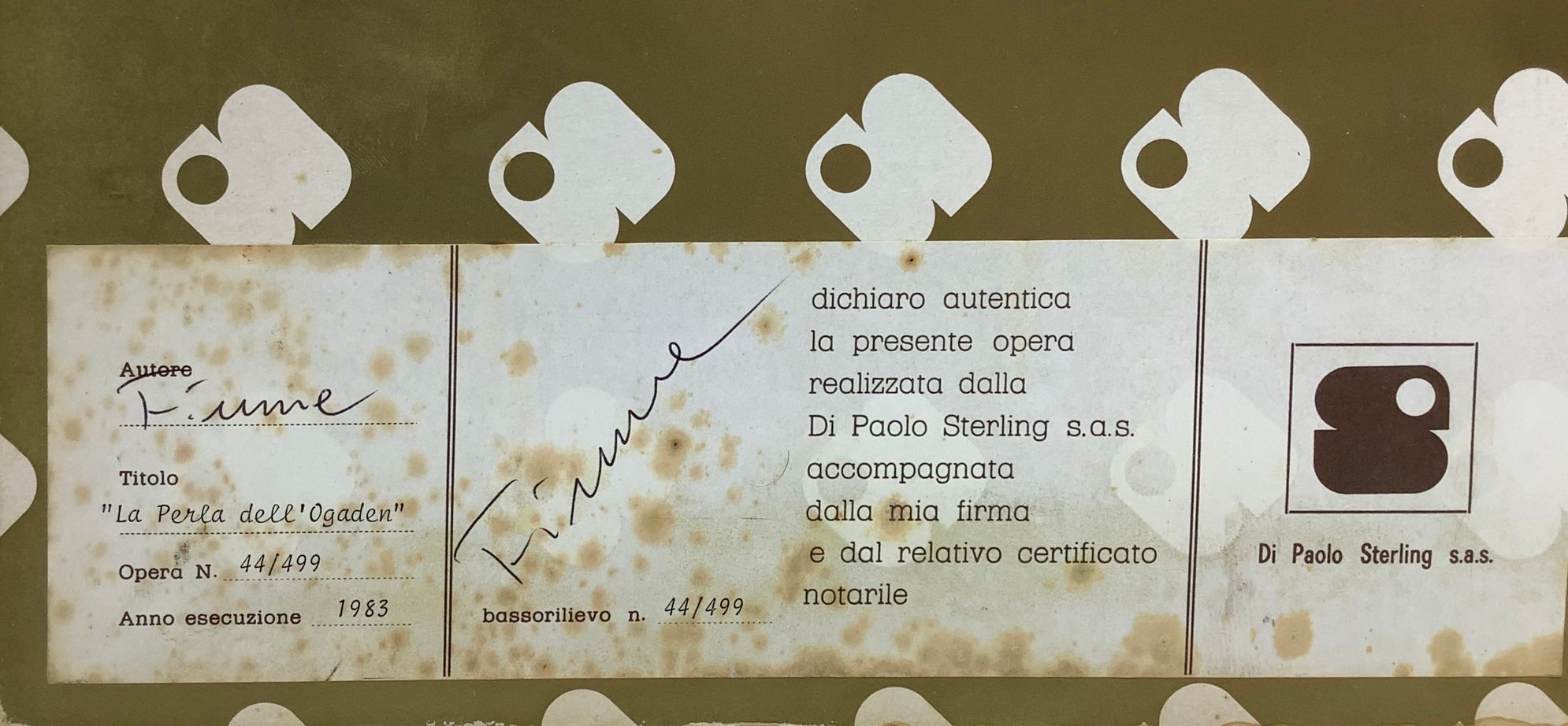 Scultura “La perla dell’Ogaden”, Salvatore Fiume (Comiso,1915 – Canzo, 1997).44/499, anno 1983, scultura in argento 925 policromo, con fondo placcato in oro 24kt. Firmato ad incisione in basso a destra. Cm 29x39. In cornice cm 65x75