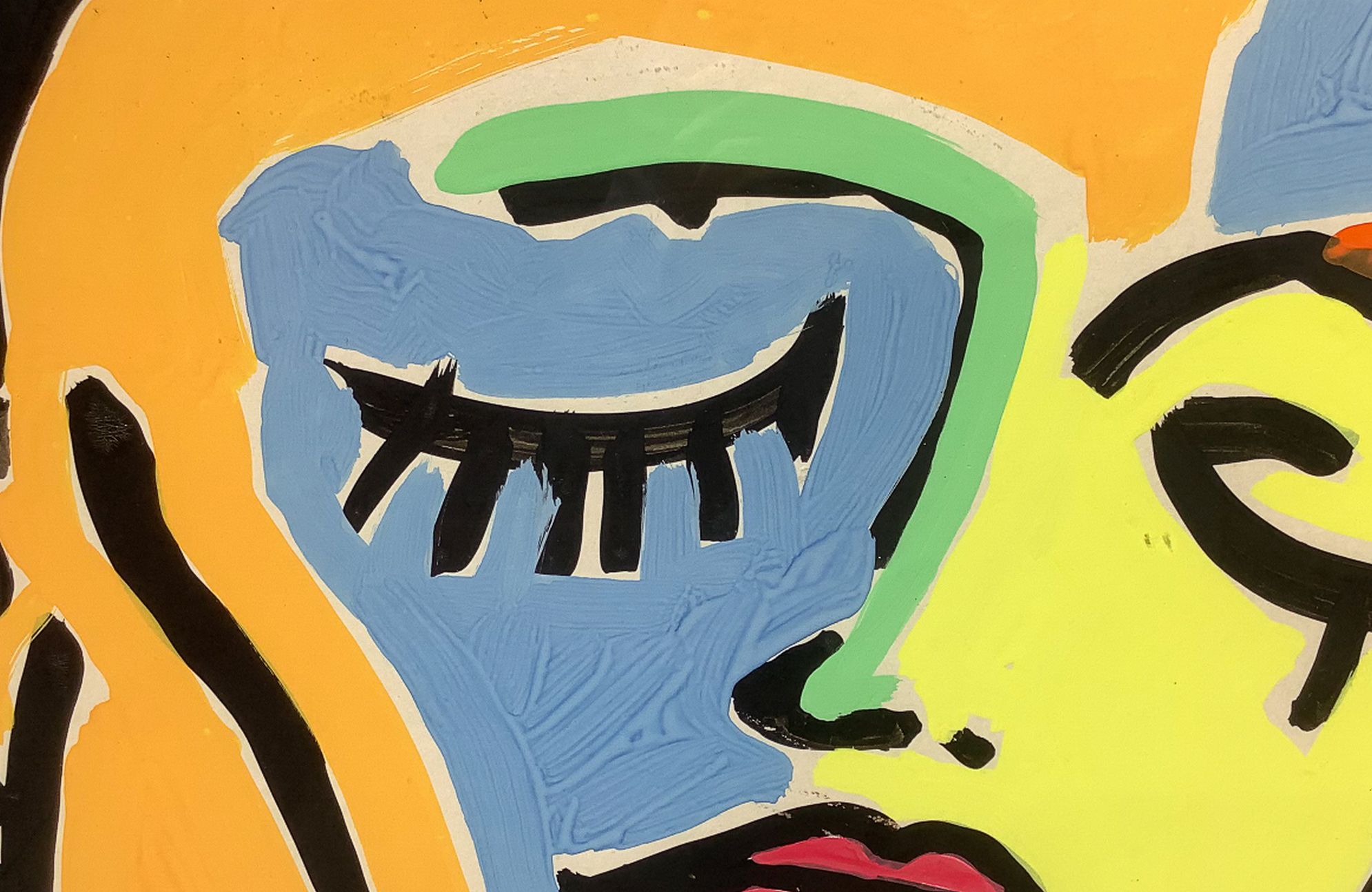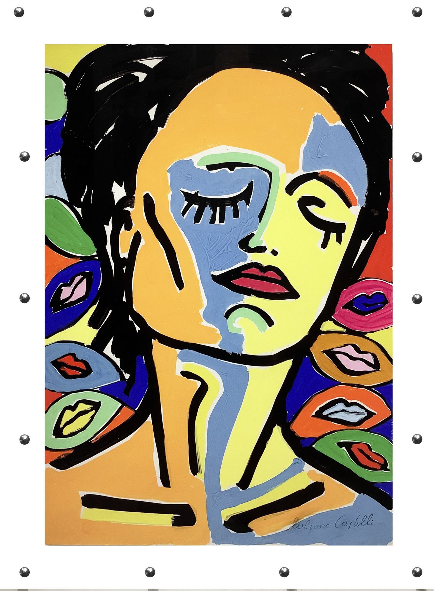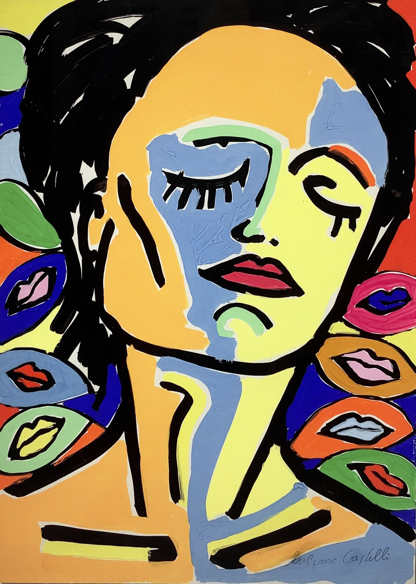Acrilico su cartoncino Donna e bocche, Luciano Castelli (1951, Lucerna, Svizzera). Cm71x51. Firmato in basso a destra. "Uno dei più importanti artisti della Bohémien di Lucerna degli anni 70. La produzione artistica di Castelli è vastissima e variegata, e spazia tra la fotografia, la grafica e la pittura, considerato uno dei rappresentanti della pittura neo-espressionista. Dal 78 al 90 si trasferisce a Berlino, e divenne uno dei "Junge Wilde ", un importante movimento artistico neo-espressionista. Negli anni successivi, l'artista sperimenta nuove tecniche pittoriche tramite l'utilizzo di una camera oscura fatta in casa, sviluppa i dipinti rotanti, che possono essere ruotati fino a 360°. A seconda di come sono appesi, il dipinto mostra allo spettatore nuovi volti, corpi o vedute di città. Nelle opere di Castelli vengono rappresentati momenti intimi e personali che l'artista riporta tramite colori accesi e contrastanti, tipici della sua pittura. Il dipinto in questione, battuto all'asta nel 2006 dalla Metropol, una casa d'asta Svedese. Mostra l'uso di una cromia a tratti psichedelici, in contrasto con il tratto nero del pennello, che con decisione delinea la figura del volto raffigurato. Questo espediente pittorico è utilizzato per enfatizzare l'intensità del momento, e alterare la percezione dello spettatore."