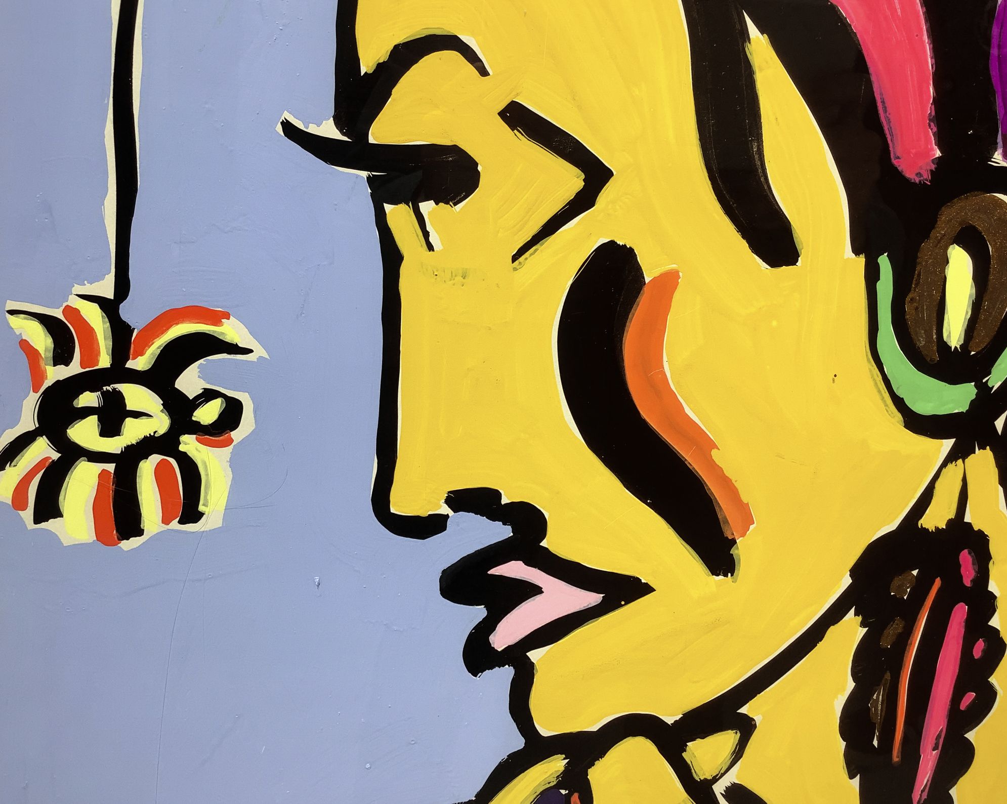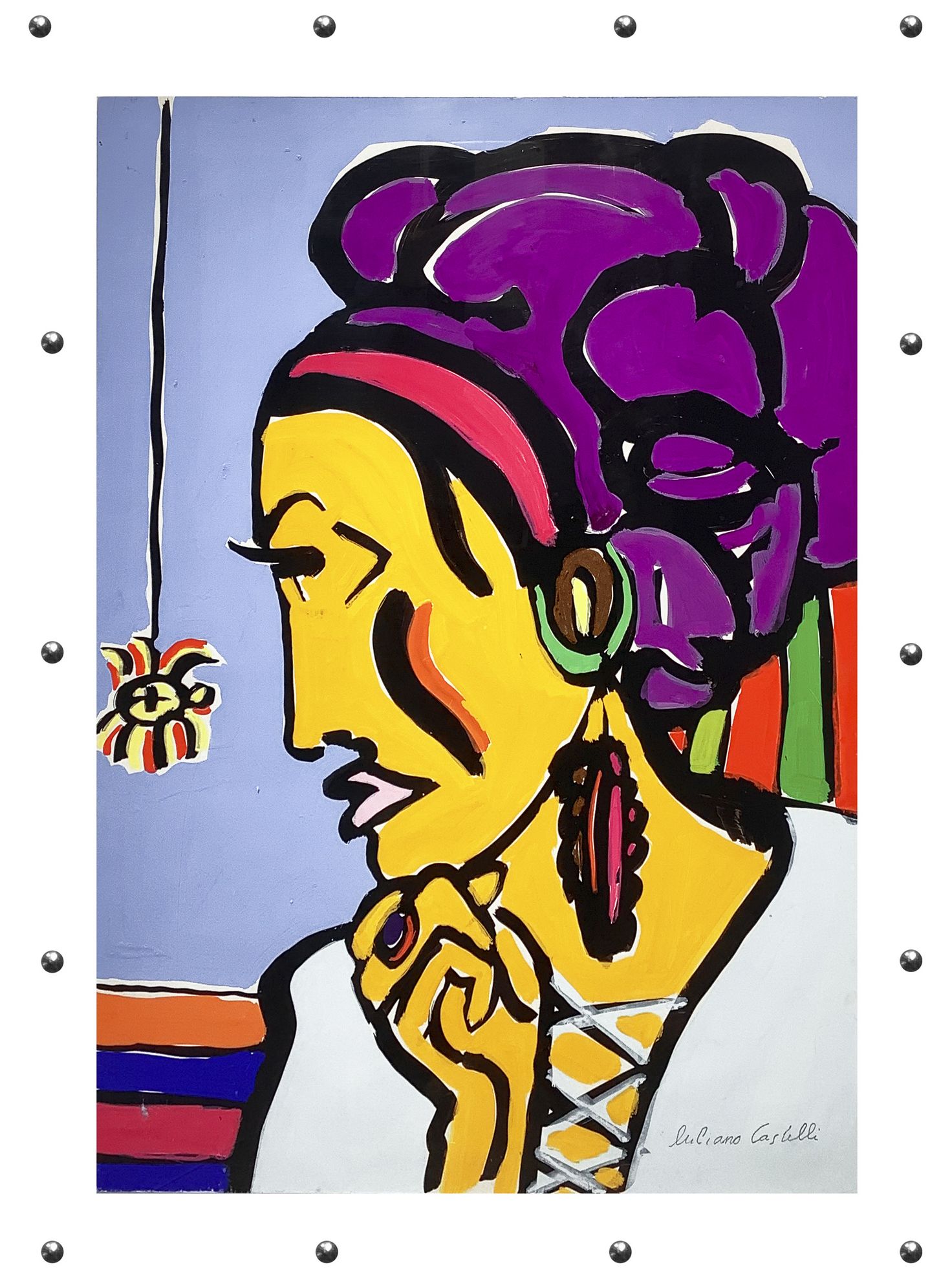 Acrilico su cartoncino Donna e ragno, Luciano Castelli (1951, Lucerna, Svizzera). Cm71x51. Firmato in basso a destra. "Uno dei più importanti artisti della Bohémien di Lucerna degli anni 70. La produzione artistica di Castelli è vastissima e variegata, e spazia tra la fotografia, la grafica e la pittura, considerato uno dei rappresentanti della pittura neo-espressionista. Dal 78 al 90 si trasferisce a Berlino, e divenne uno dei "Junge Wilde ", un importante movimento artistico neo-espressionista. Negli anni successivi, l'artista sperimenta nuove tecniche pittoriche tramite l'utilizzo di una camera oscura fatta in casa, sviluppa i dipinti rotanti, che possono essere ruotati fino a 360°. A seconda di come sono appesi, il dipinto mostra allo spettatore nuovi volti, corpi o vedute di città. Nelle opere di Castelli vengono rappresentati momenti intimi e personali che l'artista riporta tramite colori accesi e contrastanti, tipici della sua pittura. Il dipinto in questione, battuto all'asta nel 2006 dalla Metropol, una casa d'asta Svedese. Mostra l'uso di una cromia a tratti psichedelici, in contrasto con il tratto nero del pennello, che con decisione delinea la figura del volto raffigurato. Questo espediente pittorico è utilizzato per enfatizzare l'intensità del momento, e alterare la percezione dello spettatore."