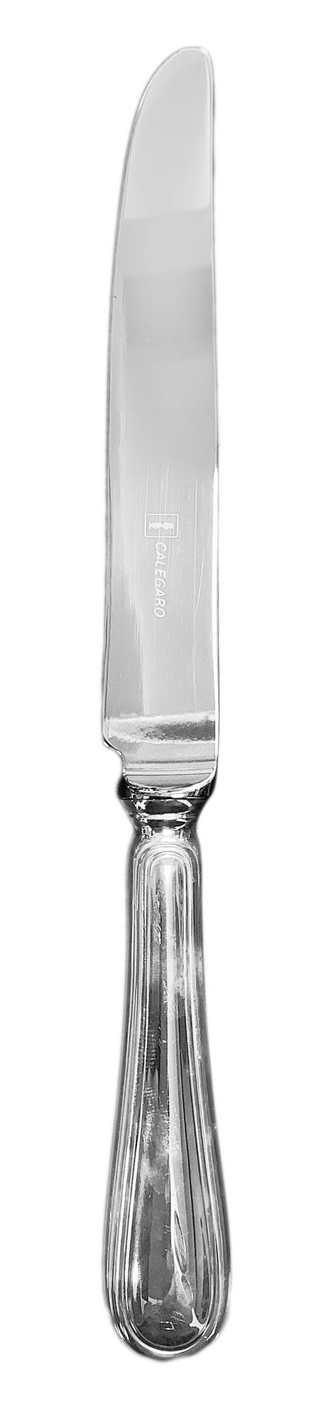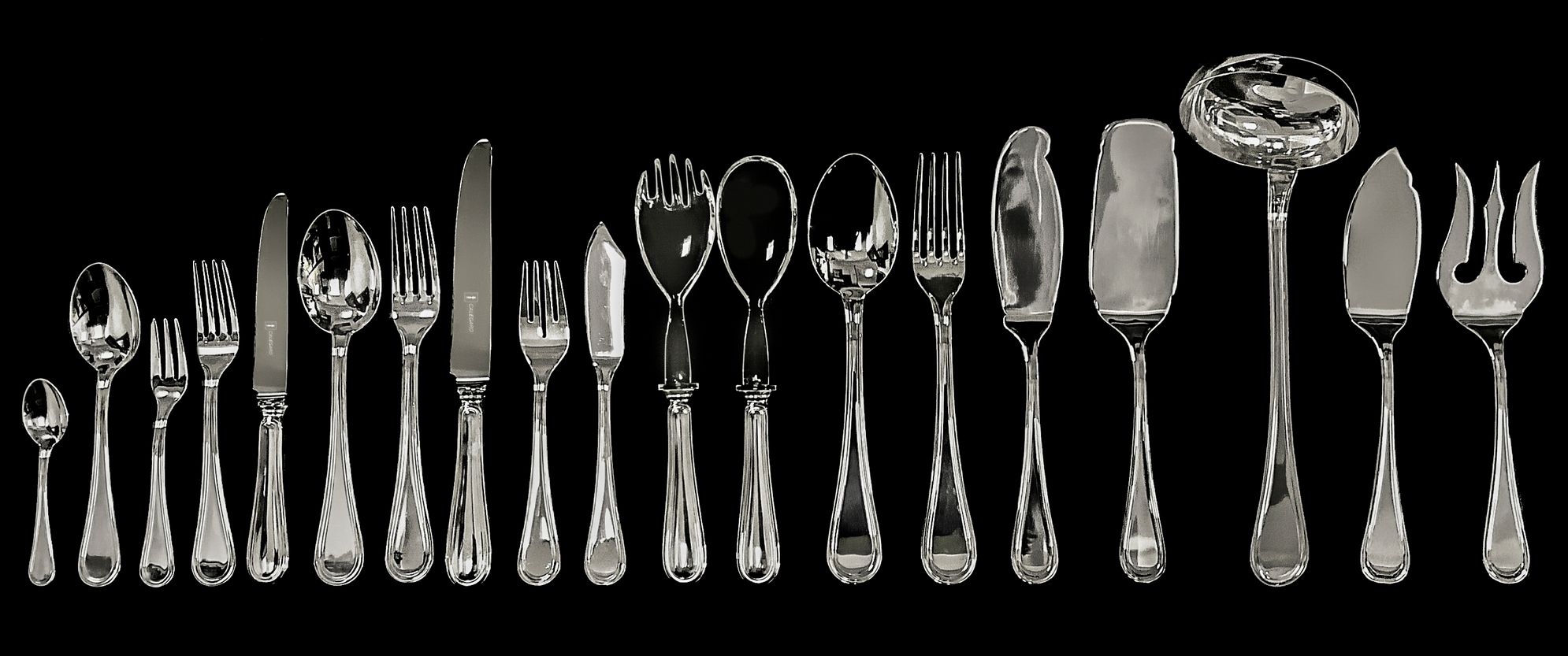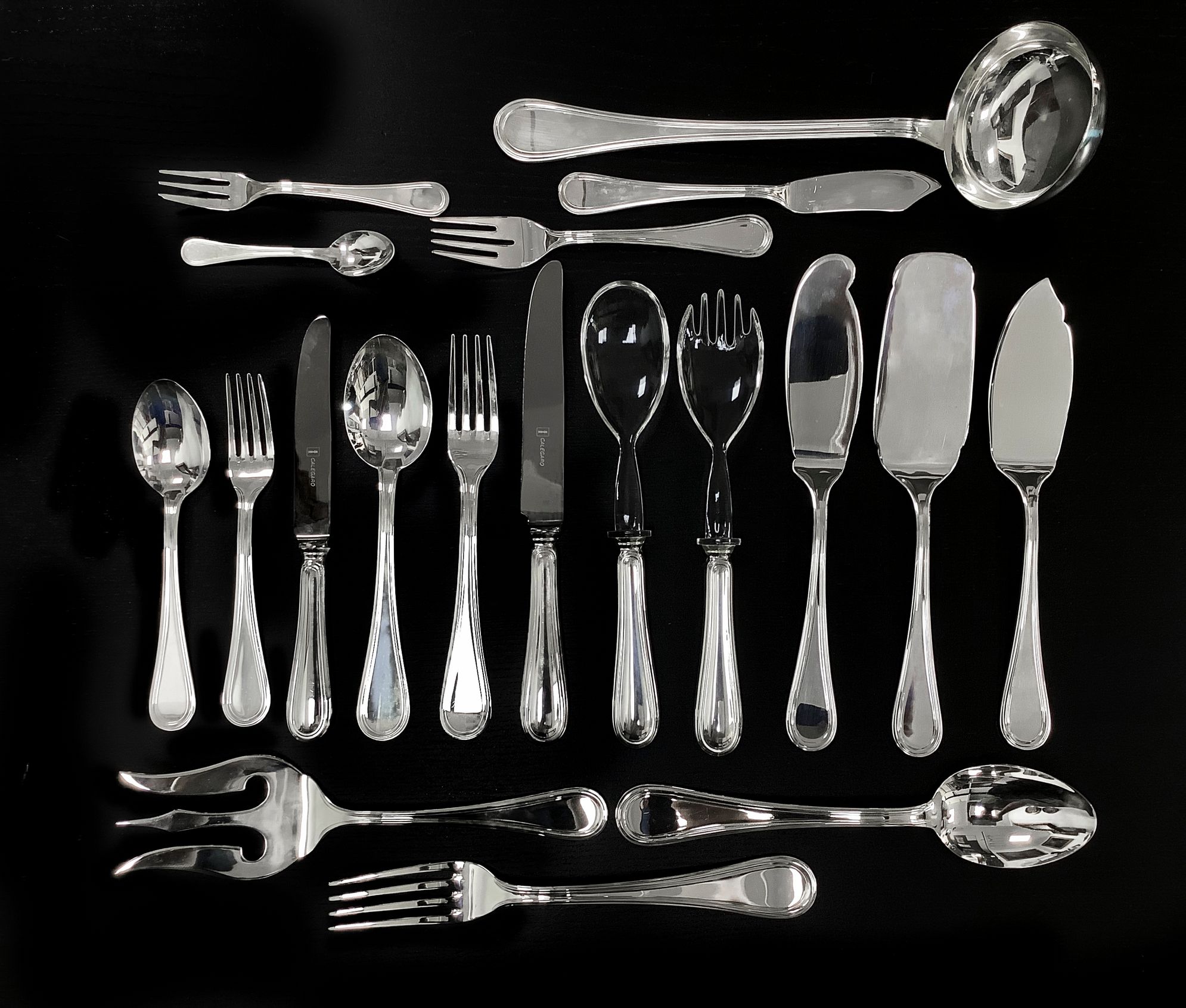 Servizio di posate in argento, Calegaro. per 12 persone. Composto da 141 pezzi: 12 cucchiai da minestra, 24 coltelli, 24 forchette, 12 coltelli, 12 forchette da pesce, 12 forchette da frutta, 12 forchette da dolce, 12 cucchiaini caffè, 12 cucchiaini dolce,