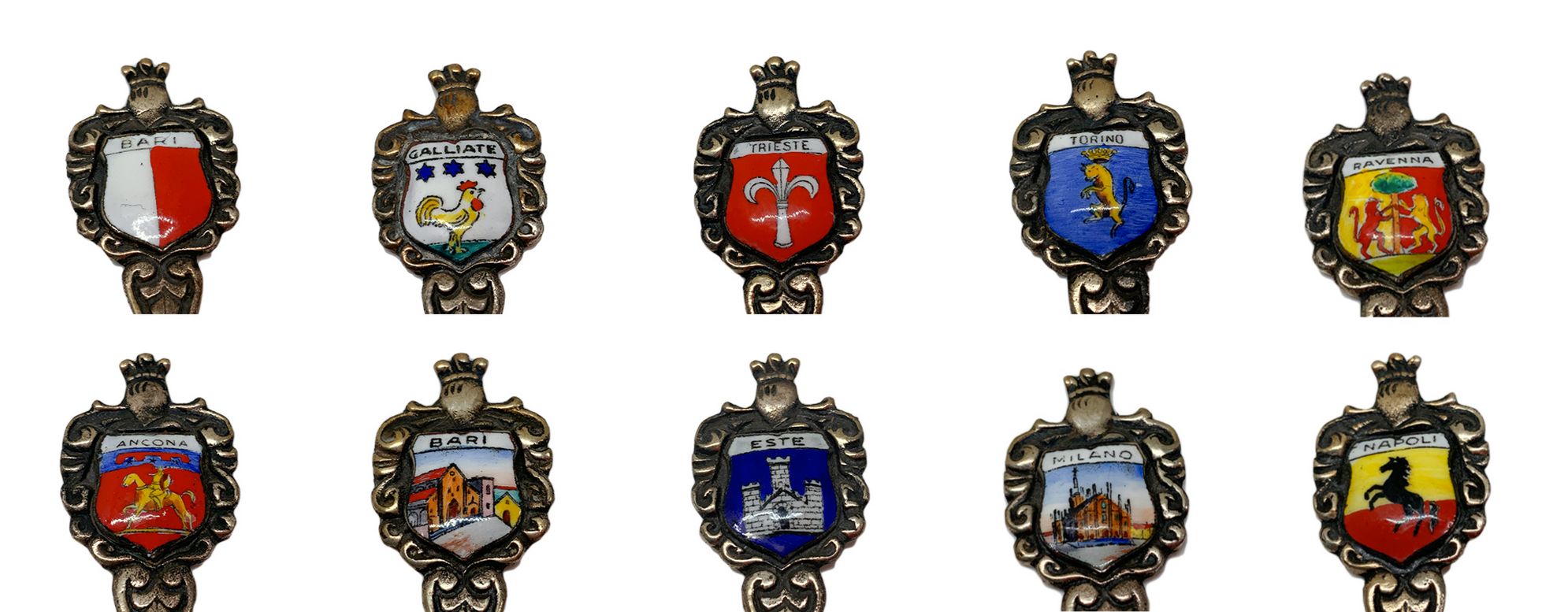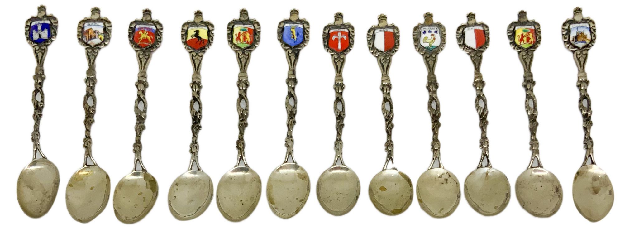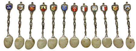 12 cucchiaini in argento 800, con smalti raffiguranti stemmi di città...